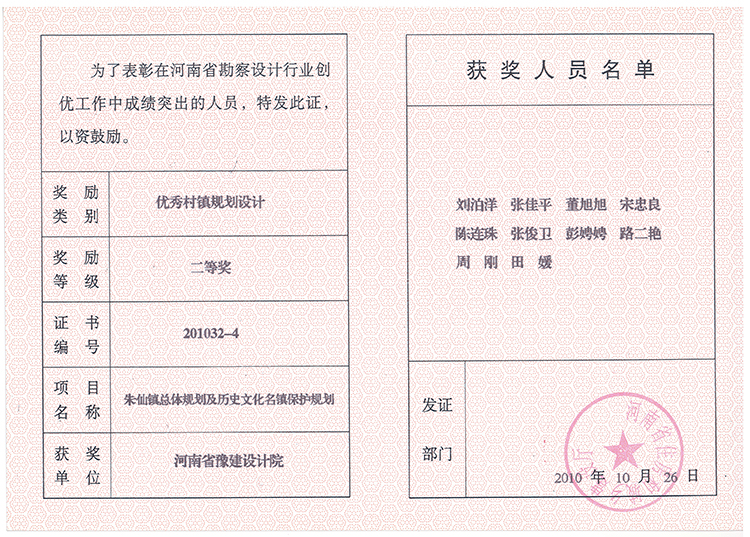 朱仙鎮(zhèn)總體規(guī)劃及歷史文化名鎮(zhèn)保護(hù)規(guī)劃獲獎(jiǎng)證書-2010.2011-公司榮譽(yù)