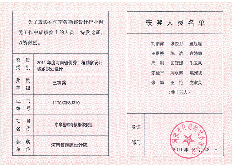 中牟縣韓寺鎮(zhèn)總體規(guī)劃獲獎證書-2010.2011-公司榮譽(yù)
