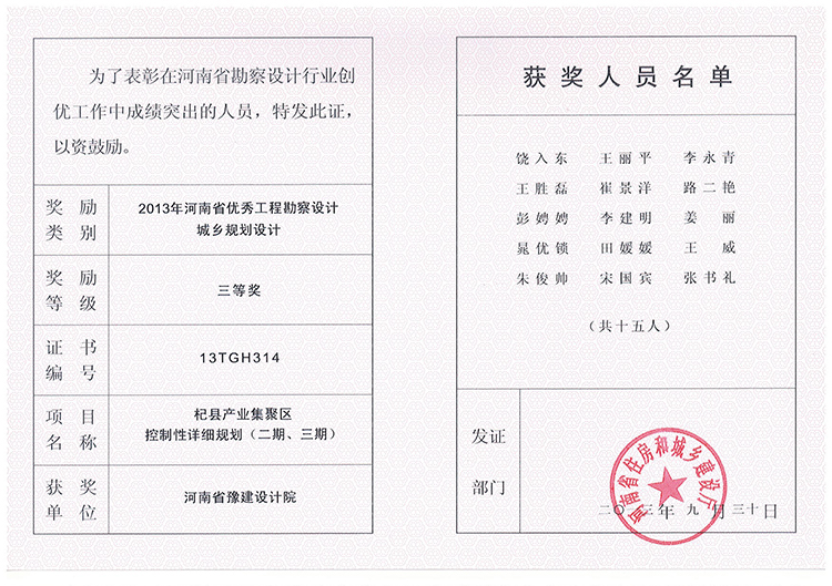 2013年獲獎(jiǎng)證書