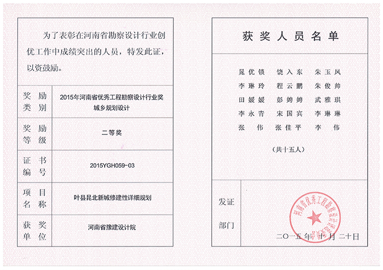 葉縣昆北新城修建性詳細規(guī)劃獲獎證書-2015年獲獎證書-公司榮譽