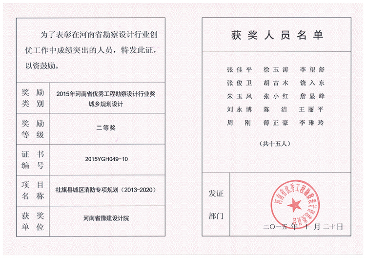 社旗縣城區(qū)消防專項(xiàng)規(guī)劃獲獎(jiǎng)證書-2015年獲獎(jiǎng)證書-公司榮譽(yù)