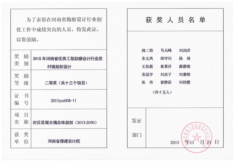 封丘留光鎮(zhèn)總體規(guī)劃獲獎(jiǎng)證書-2015年獲獎(jiǎng)證書-公司榮譽(yù)