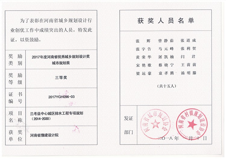 蘭考中心城區(qū)排水專(zhuān)項(xiàng)獲獎(jiǎng)證書(shū)
