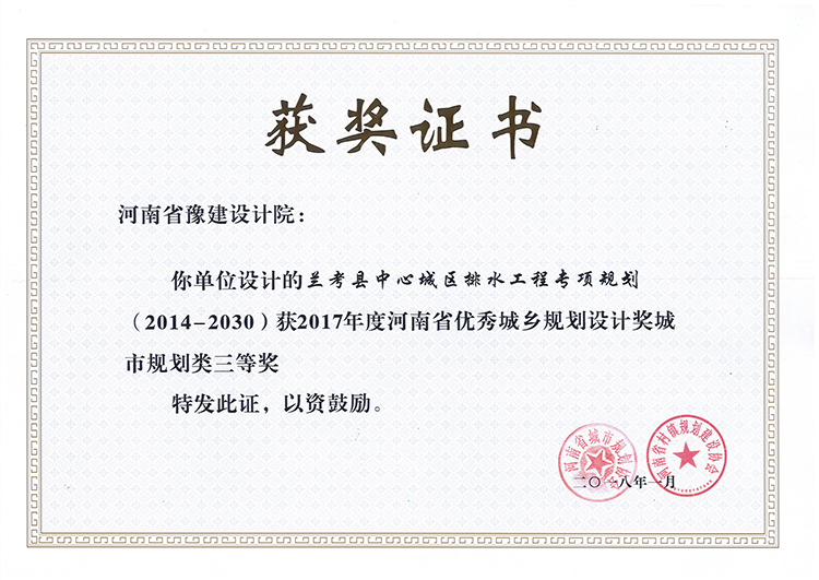 蘭考中心城區(qū)排水工程專項獲獎證書-2017年獲獎證書-公司榮譽