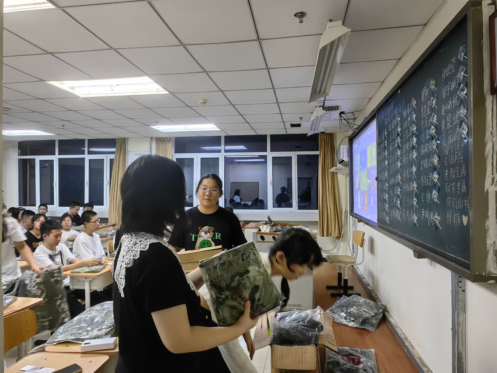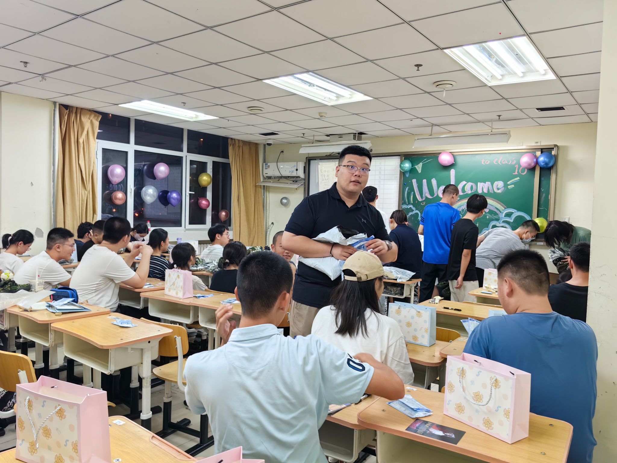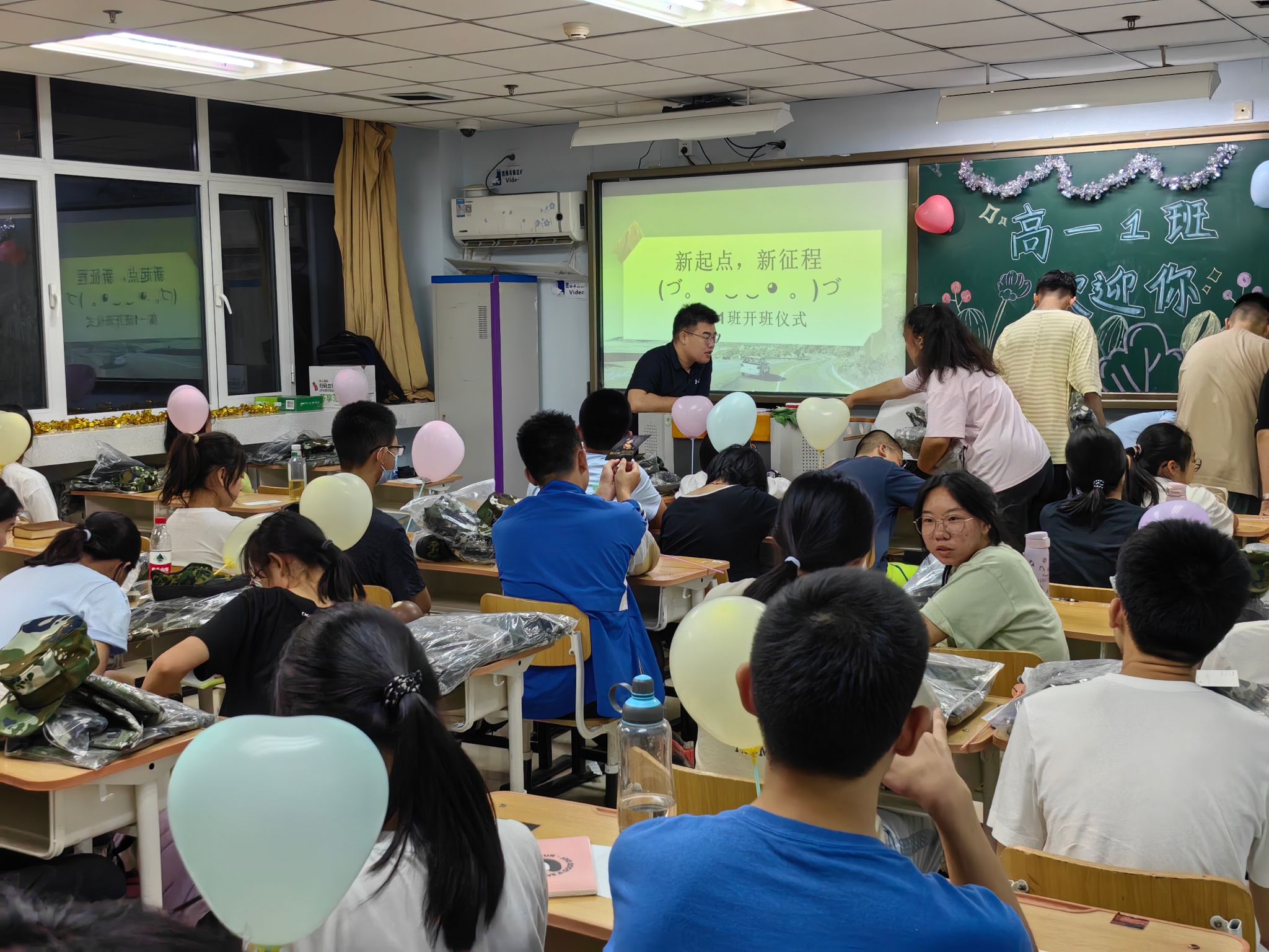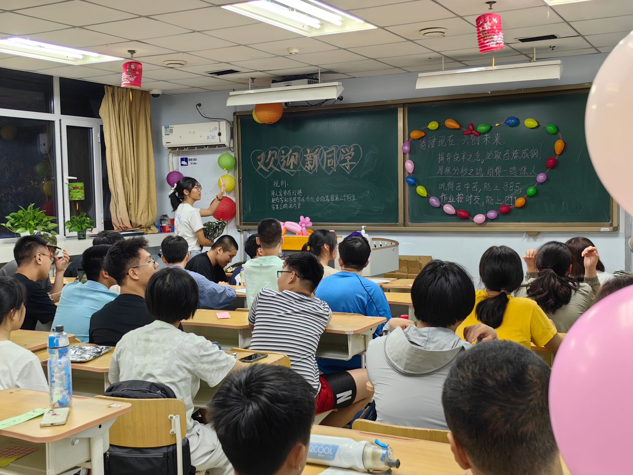 晚间夕会,同学们进入班级,班主任们精心准备了迎新板报、小礼物、灯谜游戏等,帮助同学们逐渐打破陌生、相互认识。