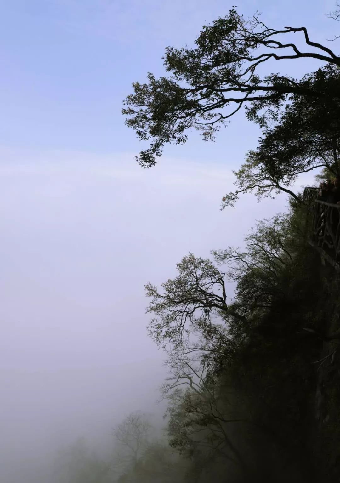 缆车继续升高,从惊叹中回过神来时,我们才忽然发现,那些远在天边可望不可即的群峰,已经真切地近在眼前。巨岩默然无声,庄重地拱卫着这一方天穹,深深扎根于中的是强柏劲松。却又无意间看见一朵山花,植在狭小的岩缝,却傲然凌风拥抱长空,留下了这悬崖峭壁间倔强的一点红。