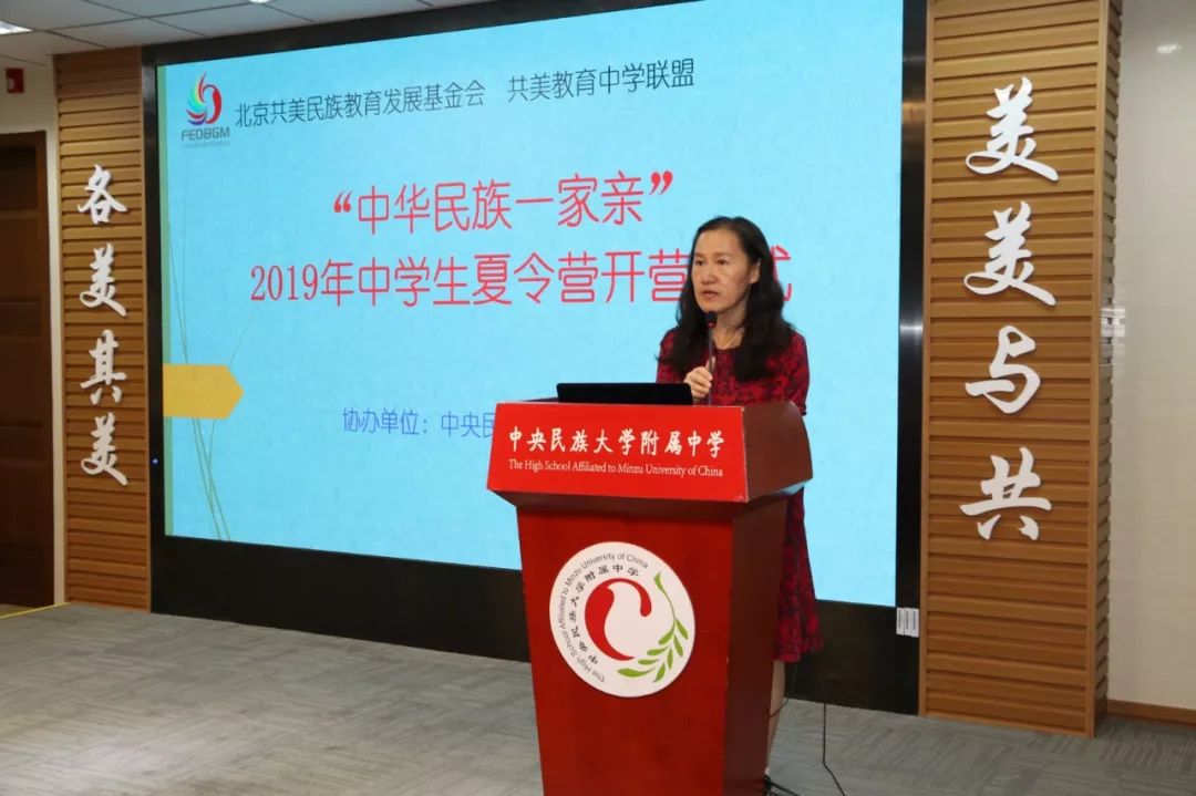 民大附中党委书记、北京市共美民族教育发展基金会副理事长佟丽娟首先介绍了该基金会是中央民大附中为更好地践行新百年办学使命发起并致力于服务扶持民族地区师生的发展。特别是在各族人民喜迎新中国成立70周年前夕,为民族地区师生搭建这样一个走进百年名校民大附中、著名高等院校感受富强奋进的新时代的优质资源平台,民大附中和基金会精心组织,为的是鼓励在场的所有学子能志存高远,开阔眼界,按照中国学生核心素养框架塑造自己,适应新中考、新高考的新要求,助力大家早日实现梦想!