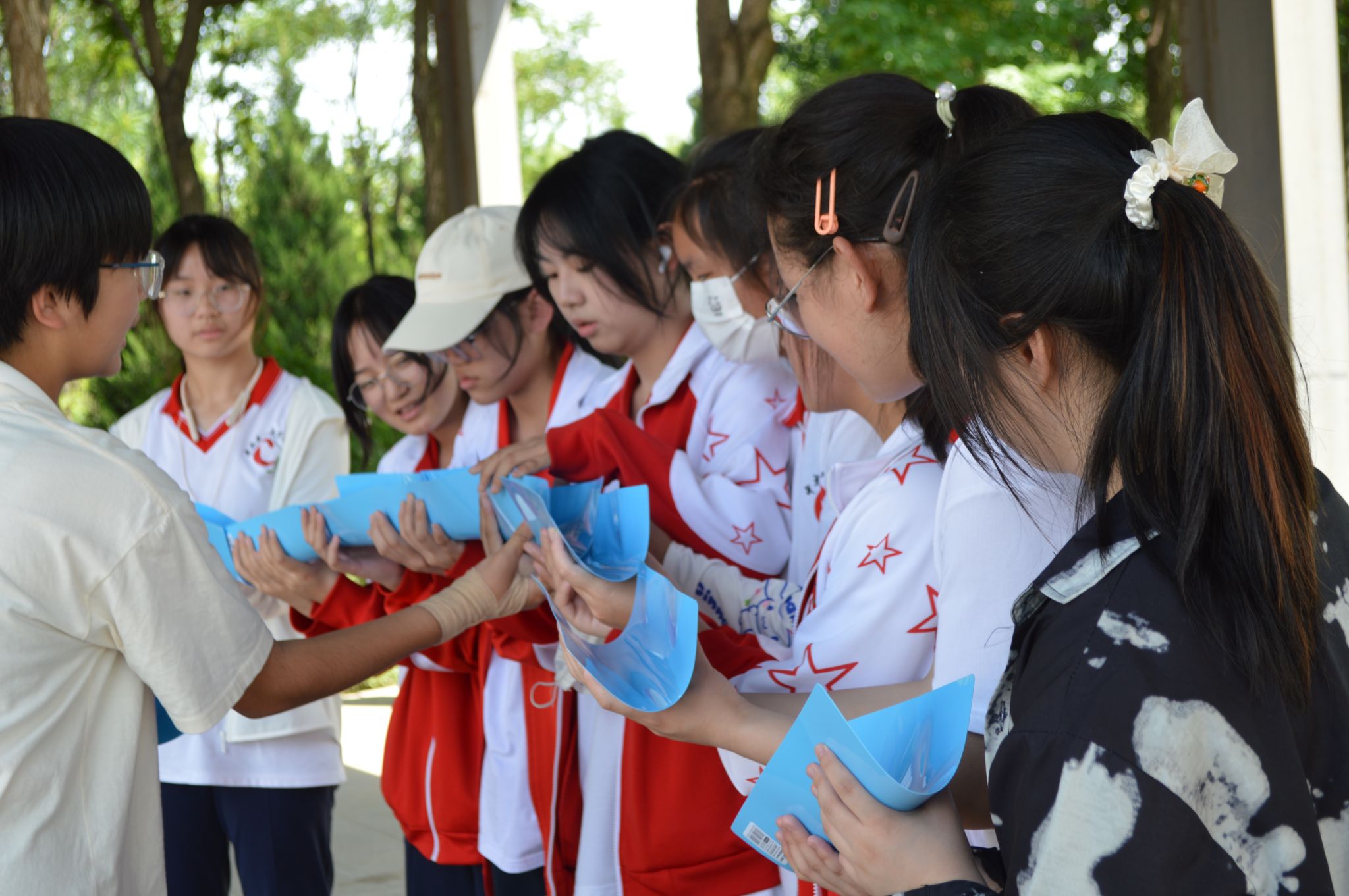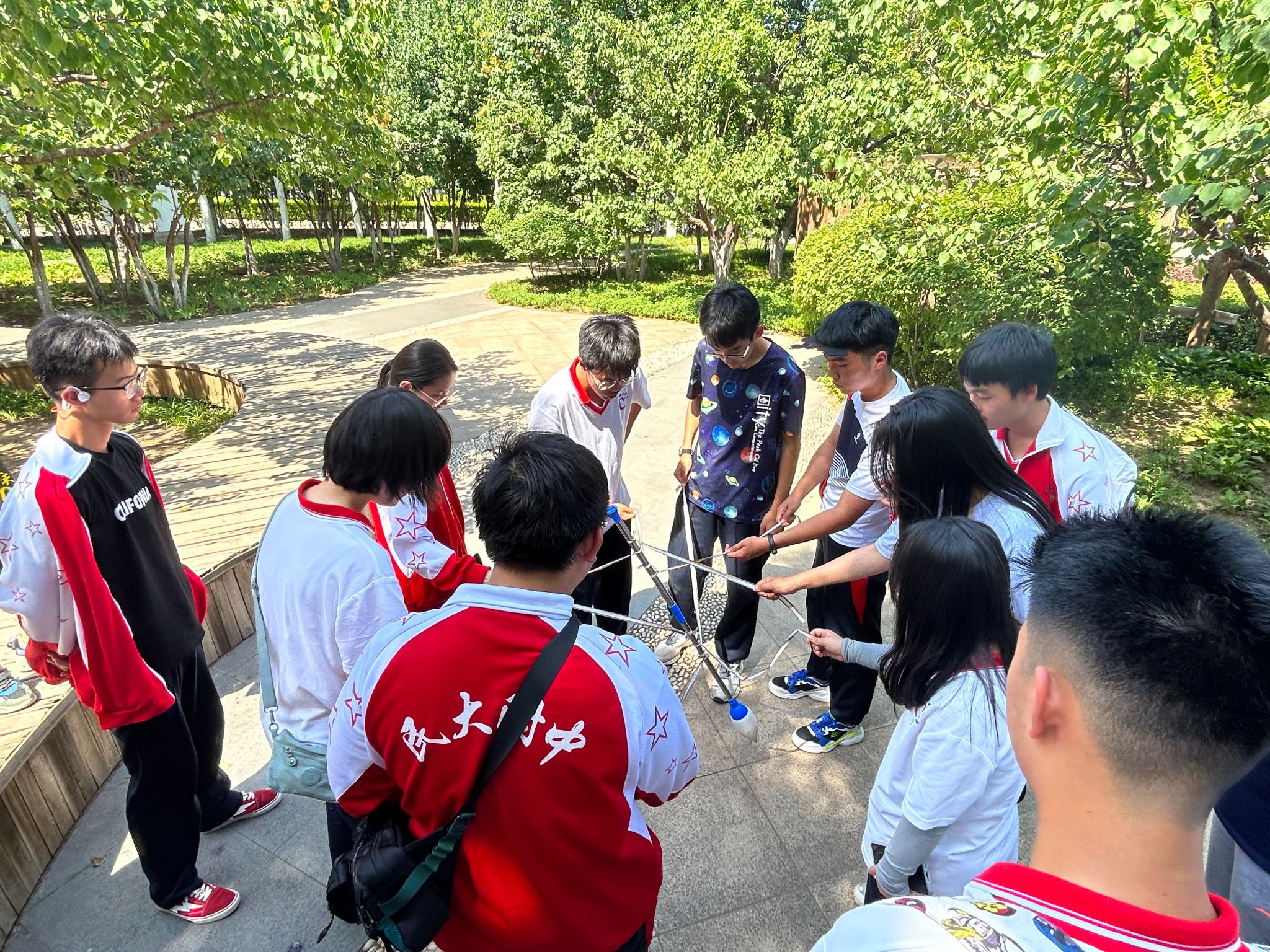 在游览之余,同学们还在带队老师的指导下分组开展了素质拓展活动:钉子传奇、乒乓冠军、神笔马良、能量传输、逃脱困境、穿越 A4、T字之谜……如何将A4纸撕成一个圆环,使得这个圆环可以容纳小组10名成员;如何在行走的同时用兵乓球拍颠球;又如何几个人控制一支大毛笔在地上写字?