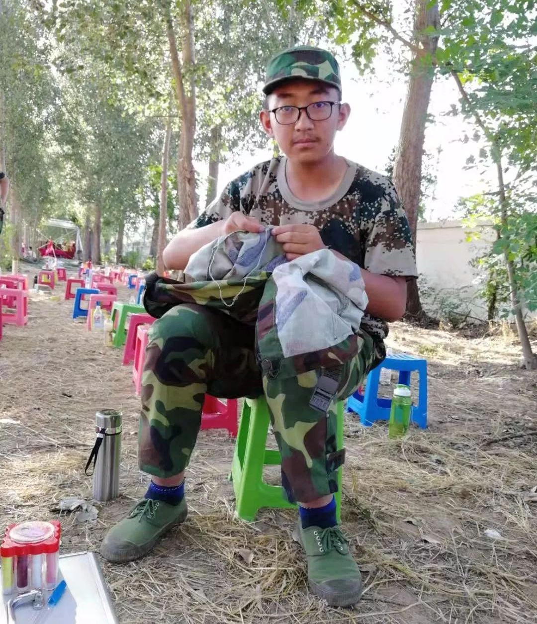 即使因为伤痛不能坚持训练,同学们也没有在一旁无所事事。12班耿釓沃脚扭伤,坐在训练场边休息的间隙,他帮同学缝好了裤子。