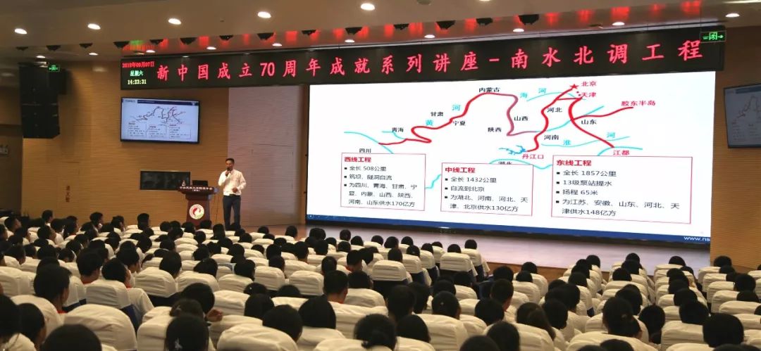 2019年9月7日下午,南水北调中线建管局宣传中心副主任、高级编辑张存有老师来到william威廉中文官网附属中学朝阳校区,开展“新中国成立70周年成就系列讲座—南水北调工程”主题讲座,这也是我校2019级新生第一次社会大课堂活动。本次讲座由学生处副主任高原主持,高一全体师生倾听了本次讲座。