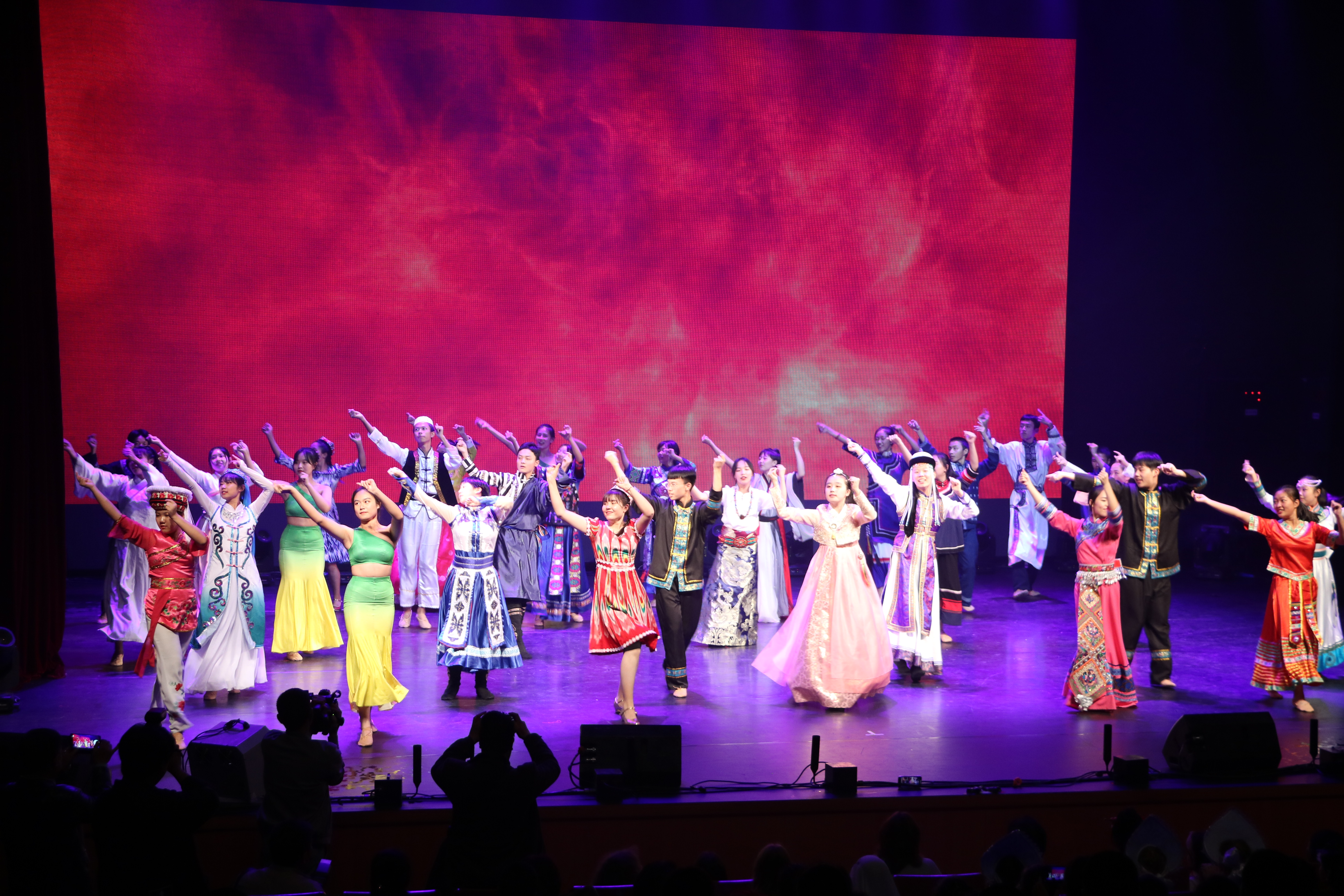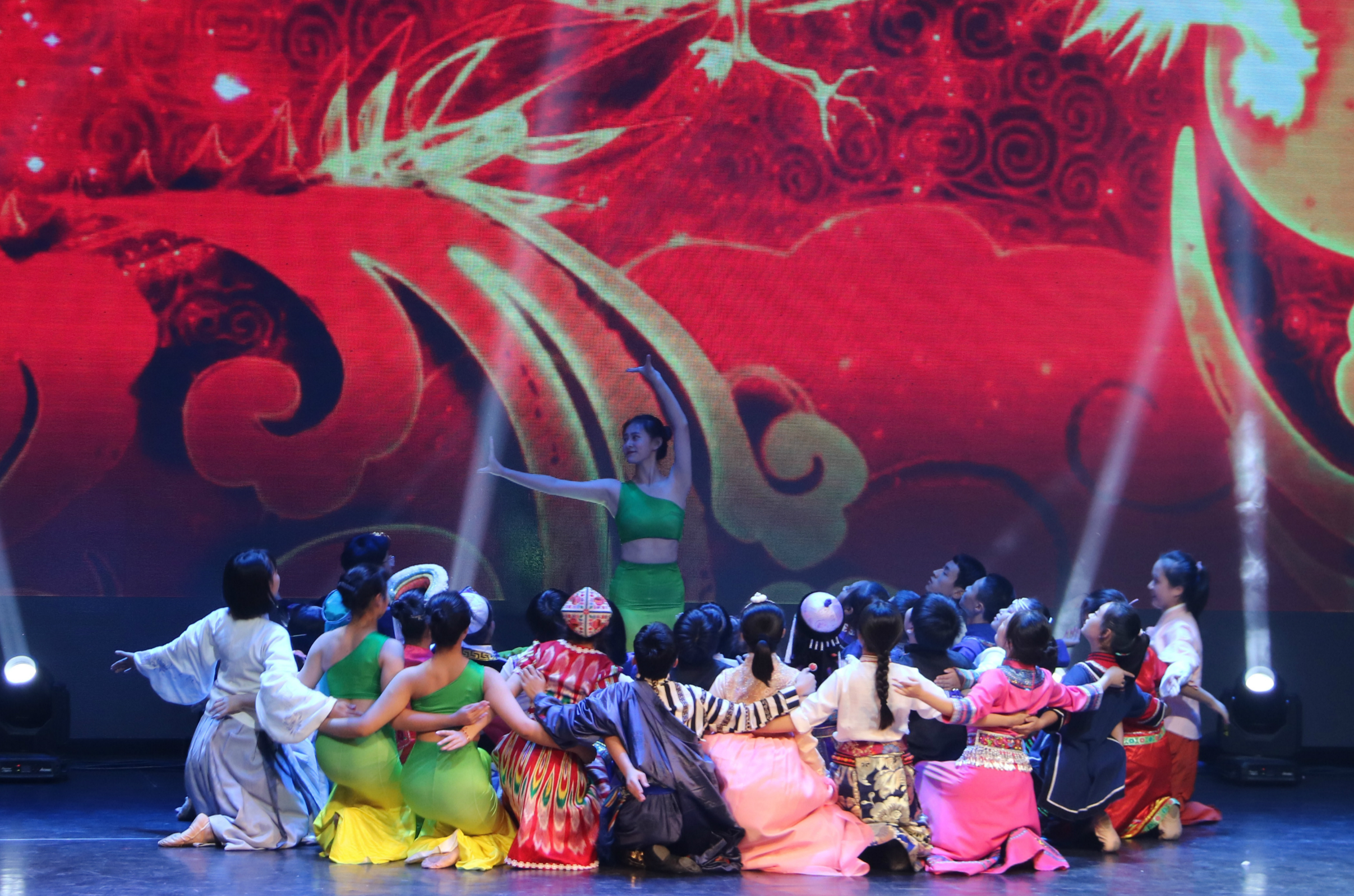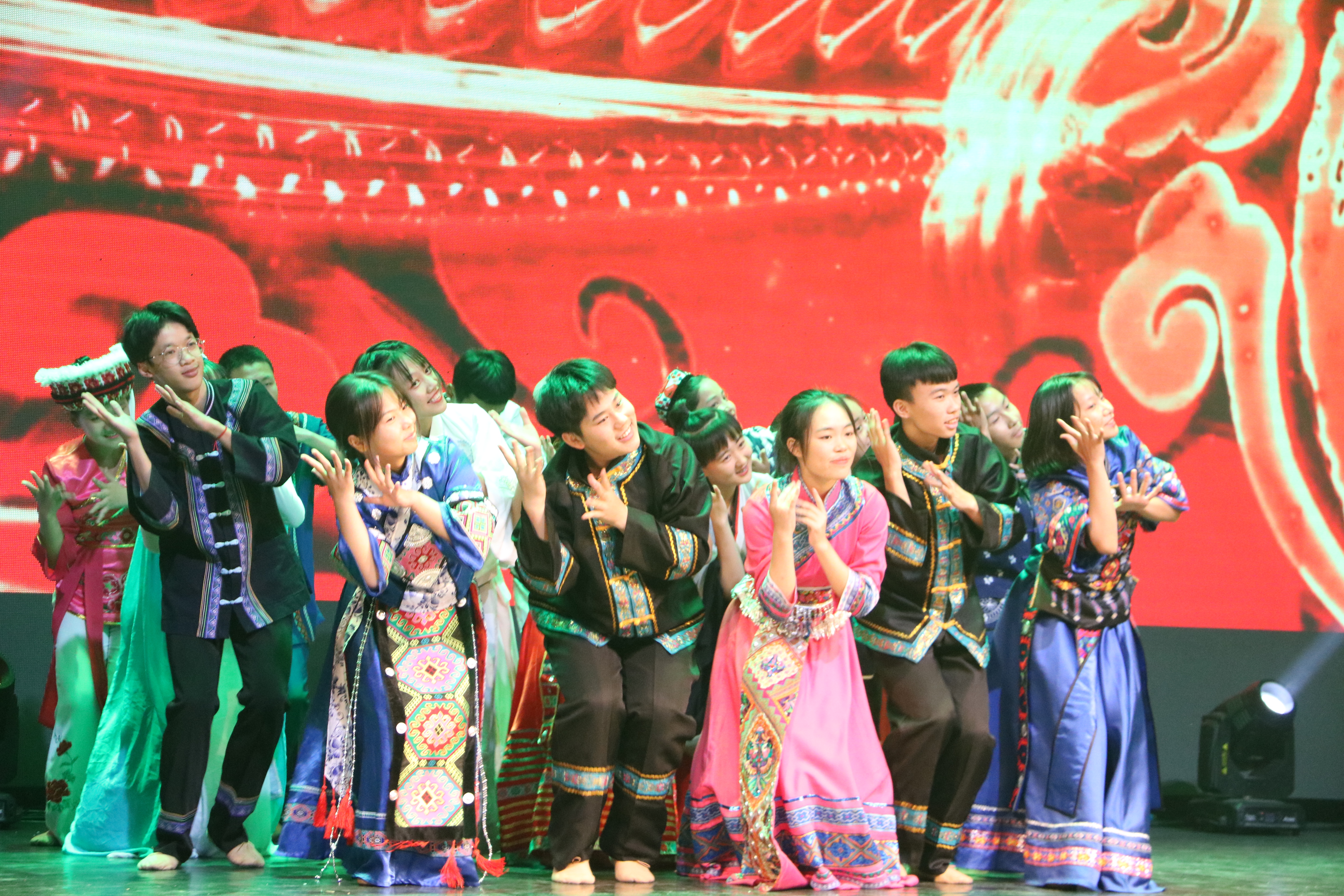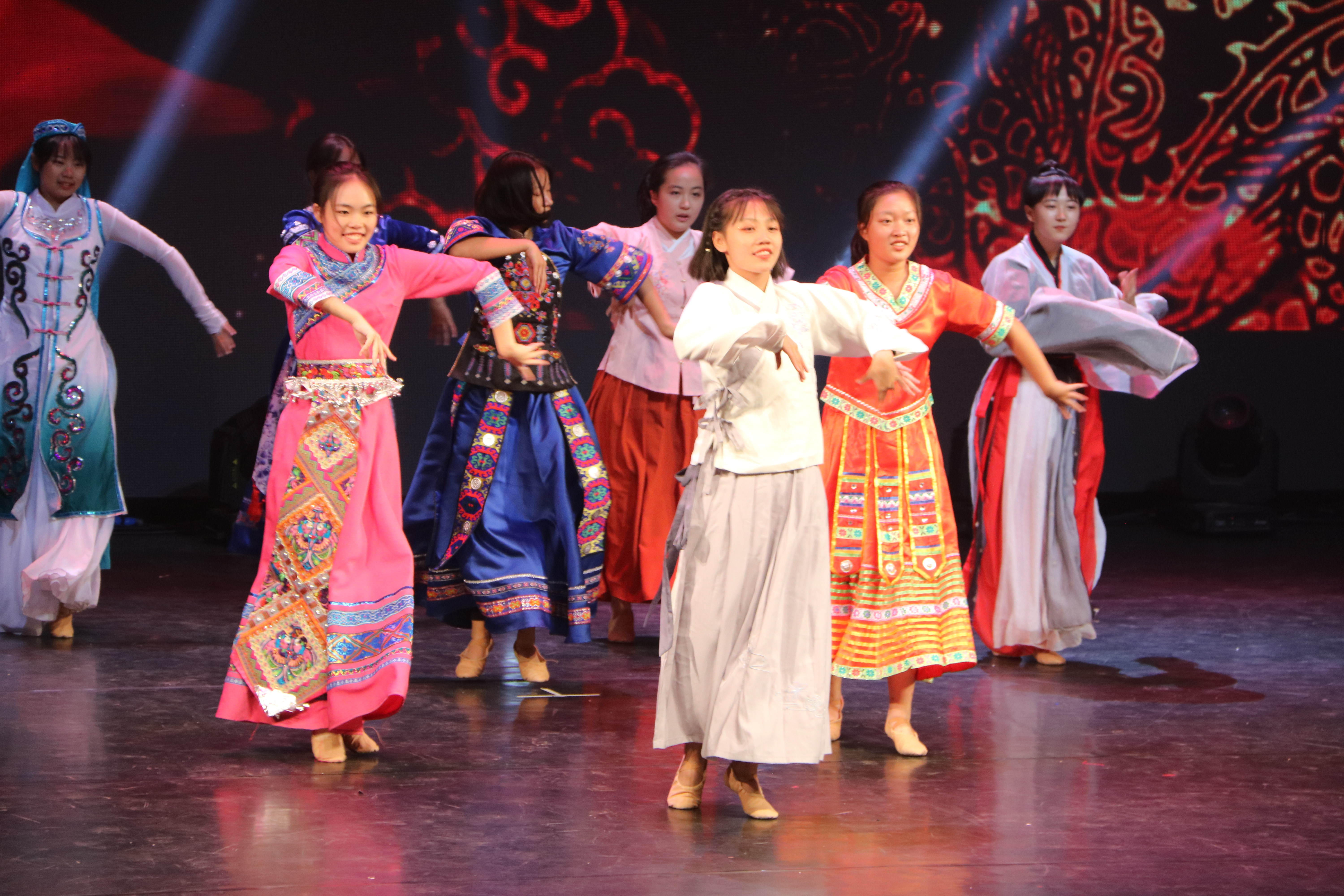 我校三十多名高一新同学带来的民族舞蹈《多彩中华》压轴登场。经过一周汗水挥洒与认真努力,最终的演出不负众望。舞台上,他们大展风采,神采飞扬,起舞的衣袖编织出民族锦帜,奏出民族韵律,整个剧场掌声此起彼伏。
