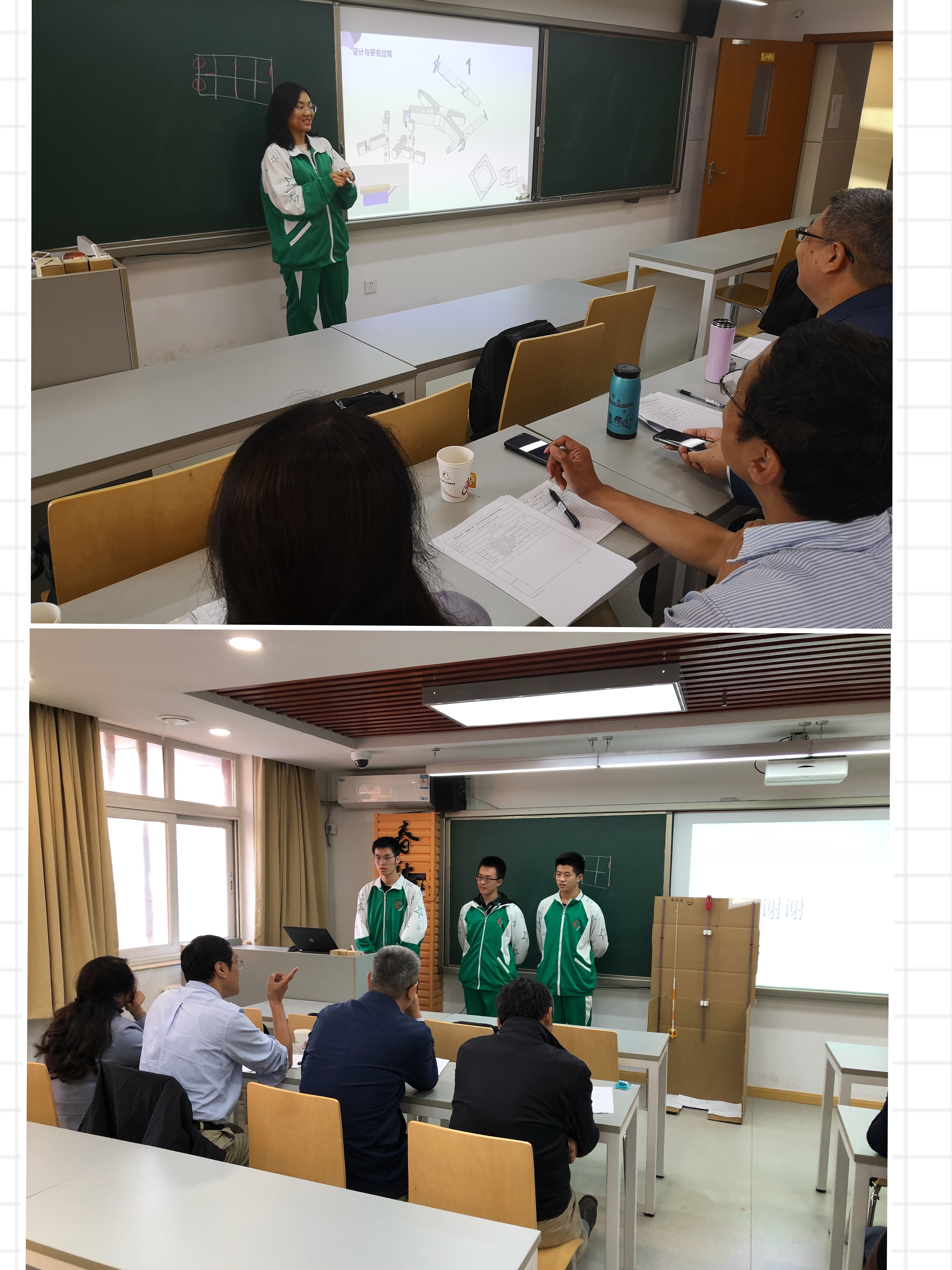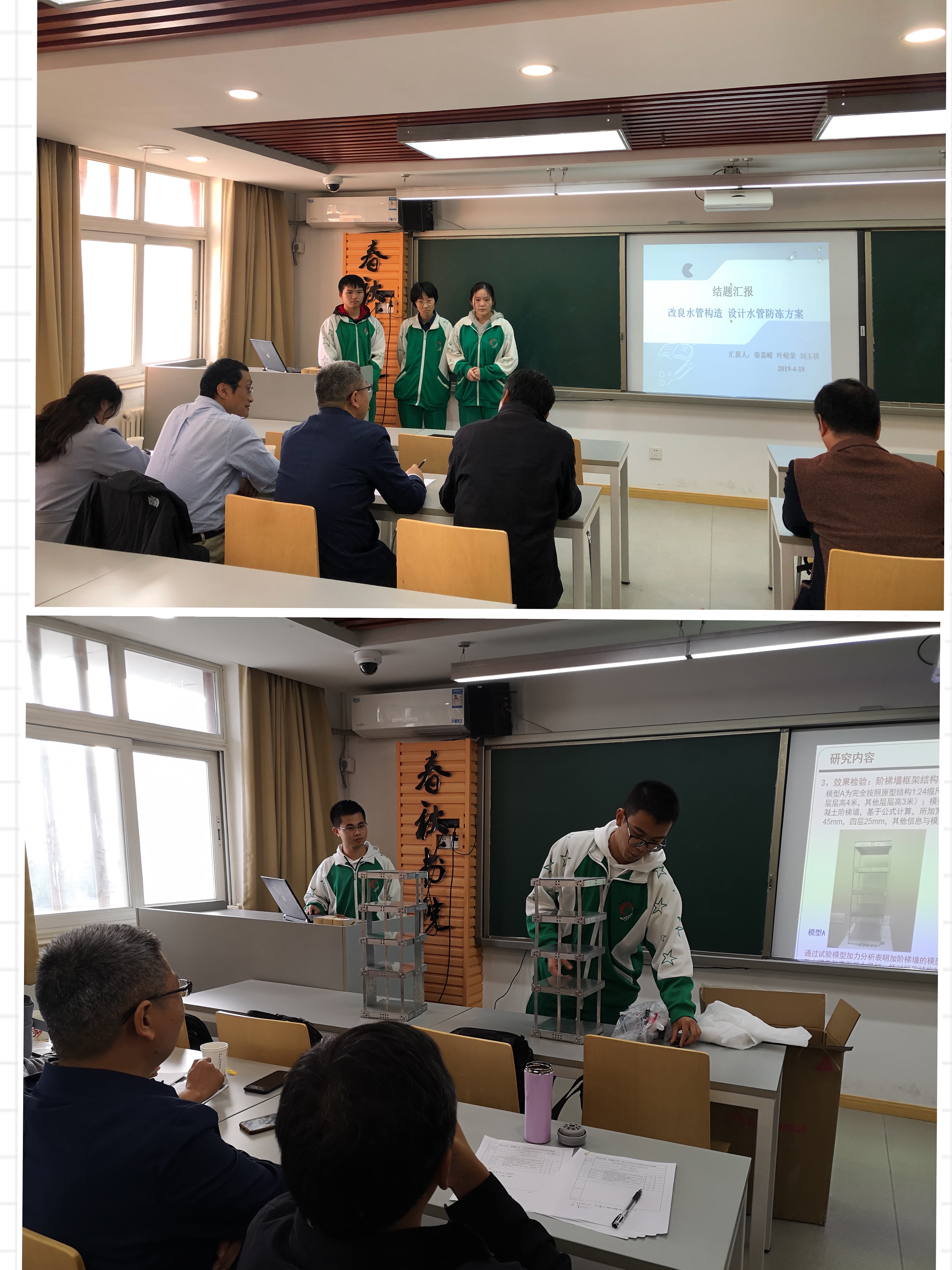 首先进行的是高三“苗圃创新立项结题”工作。经过一年多的反复探索改进,来自6个小组的16名同学,激情澎湃地将自己的研究成果向各位专家做了展示汇报。六组成员分别以《运用小型水轮机设计水管防冻方案》、《采用阶梯墙改善框架结构地震下底部薄弱机制》、《基于榫卯结构制作便携式桌面延展器》、《利用物理学方法提升家用玻璃防台风能力》、《根据闭门器原理改进宿舍上下床梯子过窄问题》和《下凹型沥青路面排水改进》为题进行了结题答辩。