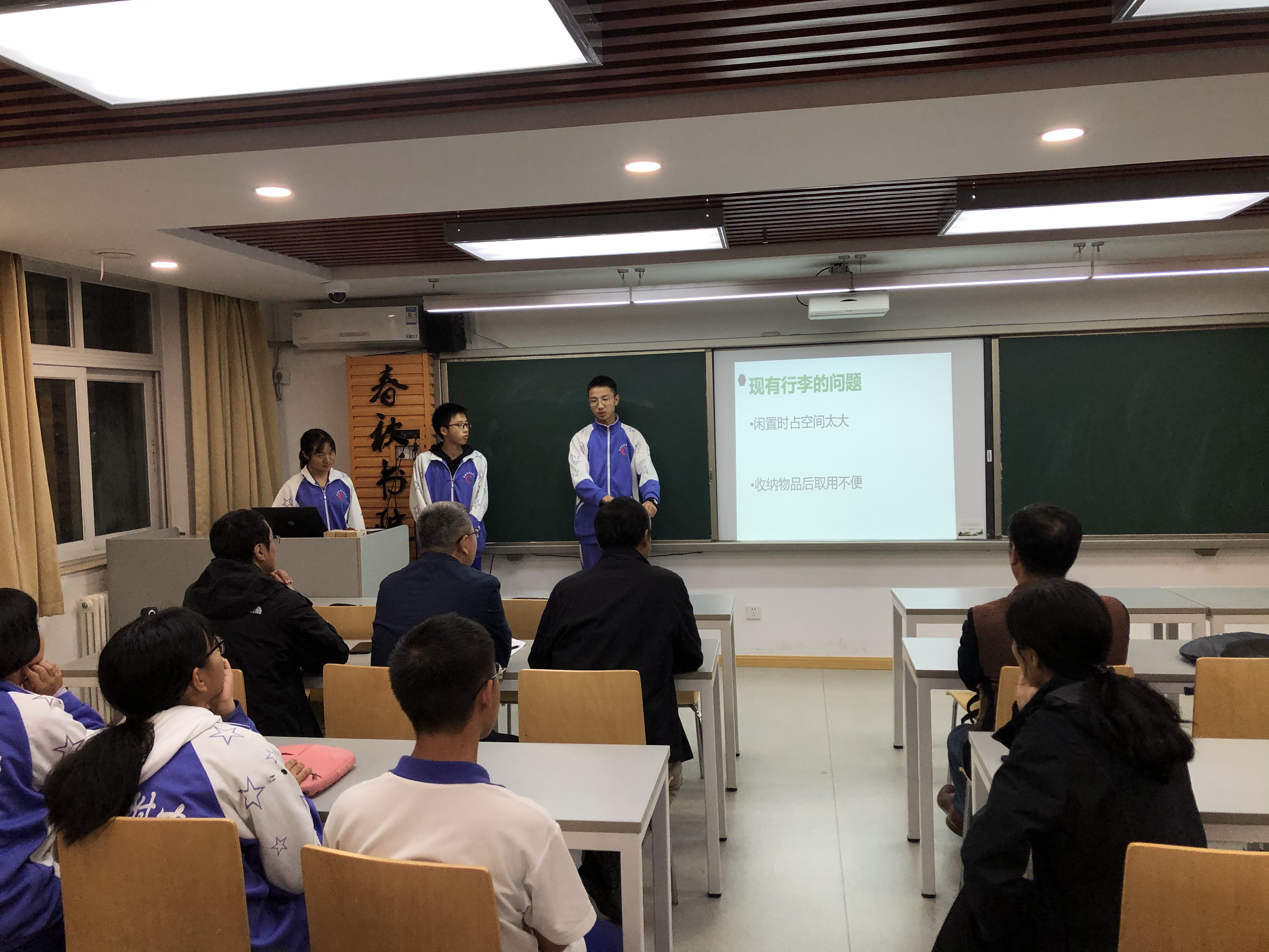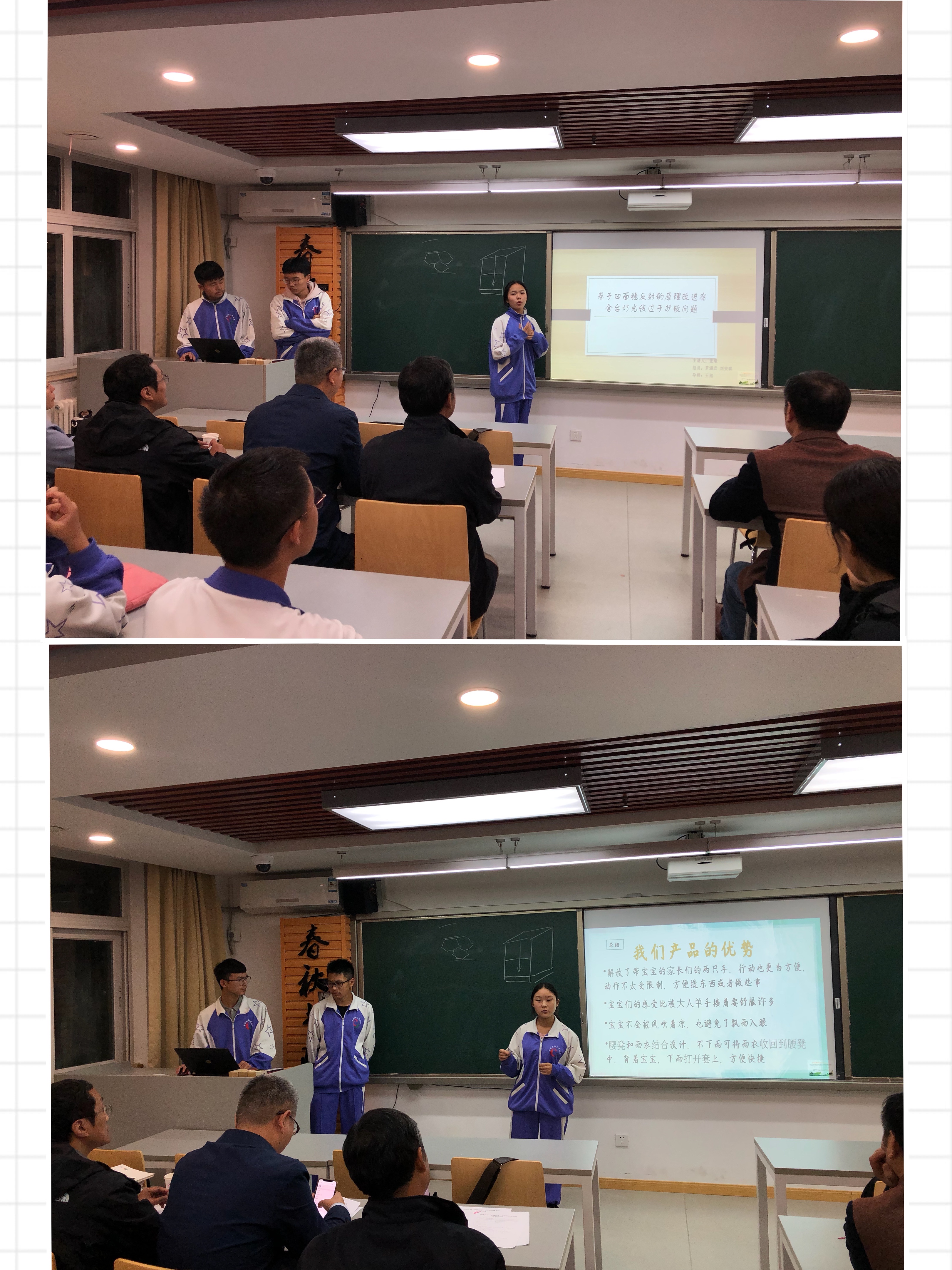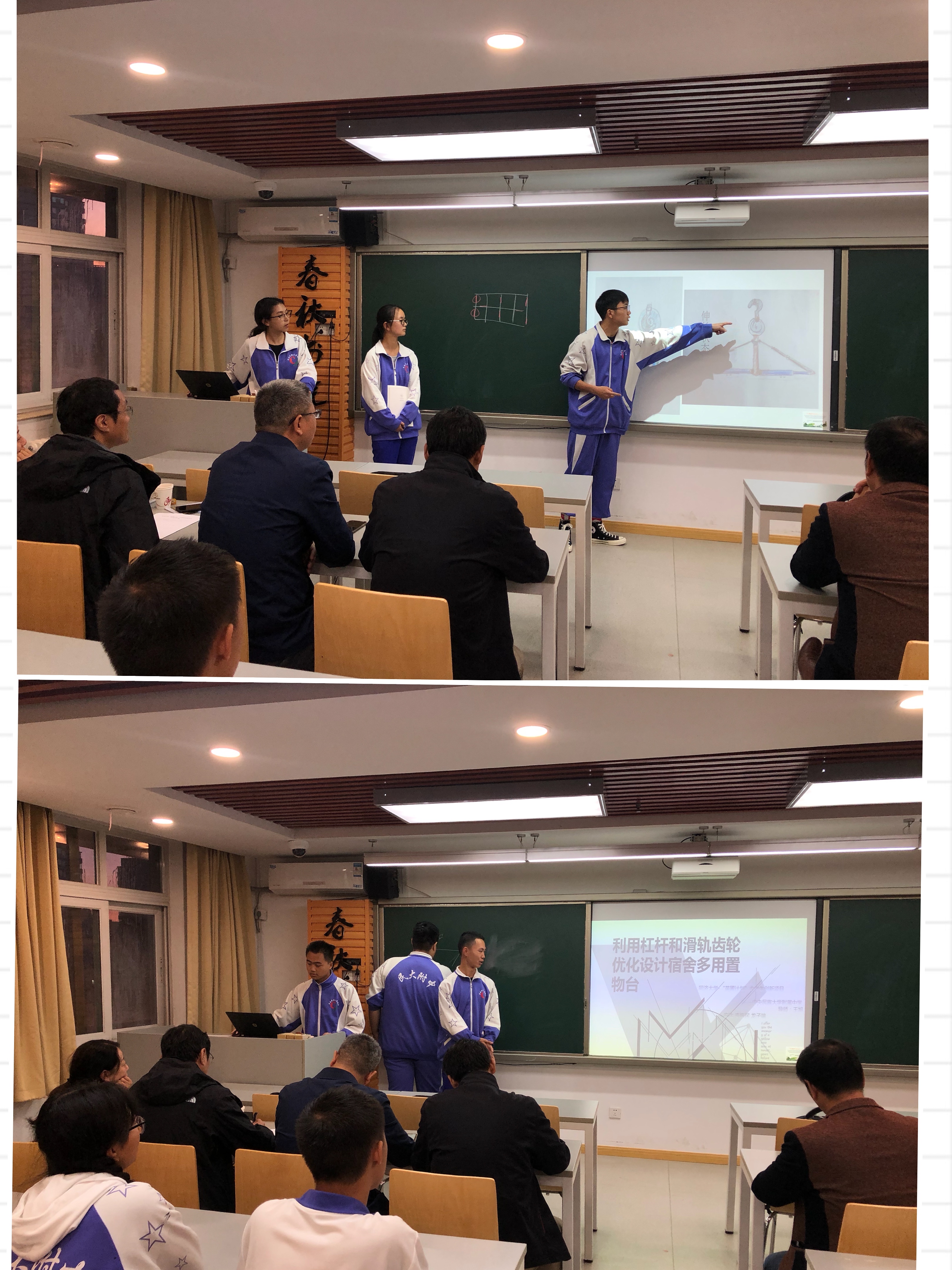 稍作休息后,专家组又紧锣密鼓地开始了高二年级”苗圃计划“新成员的开题汇报。29名同学组成的10个小组将自己的创意想法向评委做了阐述。10组同学分别以《利用伸缩杆结构和压强原理改进的万能衣架》、《利用杠杆和滑轨齿轮优化设计宿舍多用置物台》、《利用物理摩擦力原理制作水杯防倒底座》、《利用摩擦起电原理基于粘头发问题对扫把进行优化》、《利用离心力将雨伞甩干的甩干机》、《基于折叠及拼装原理对现有行李箱收纳能力的优化》、《基于可调卡口和旋转改进桌面杯夹》、《基于凹透镜反射原理改进宿舍台灯光线过于扩散的问题》、《关于利用抱枕被子收纳的原理将婴儿背带腰凳和雨衣融合的创新优化》和《利用吸盘改进雨伞挂》为题,对自己的立项课题进行了展示。