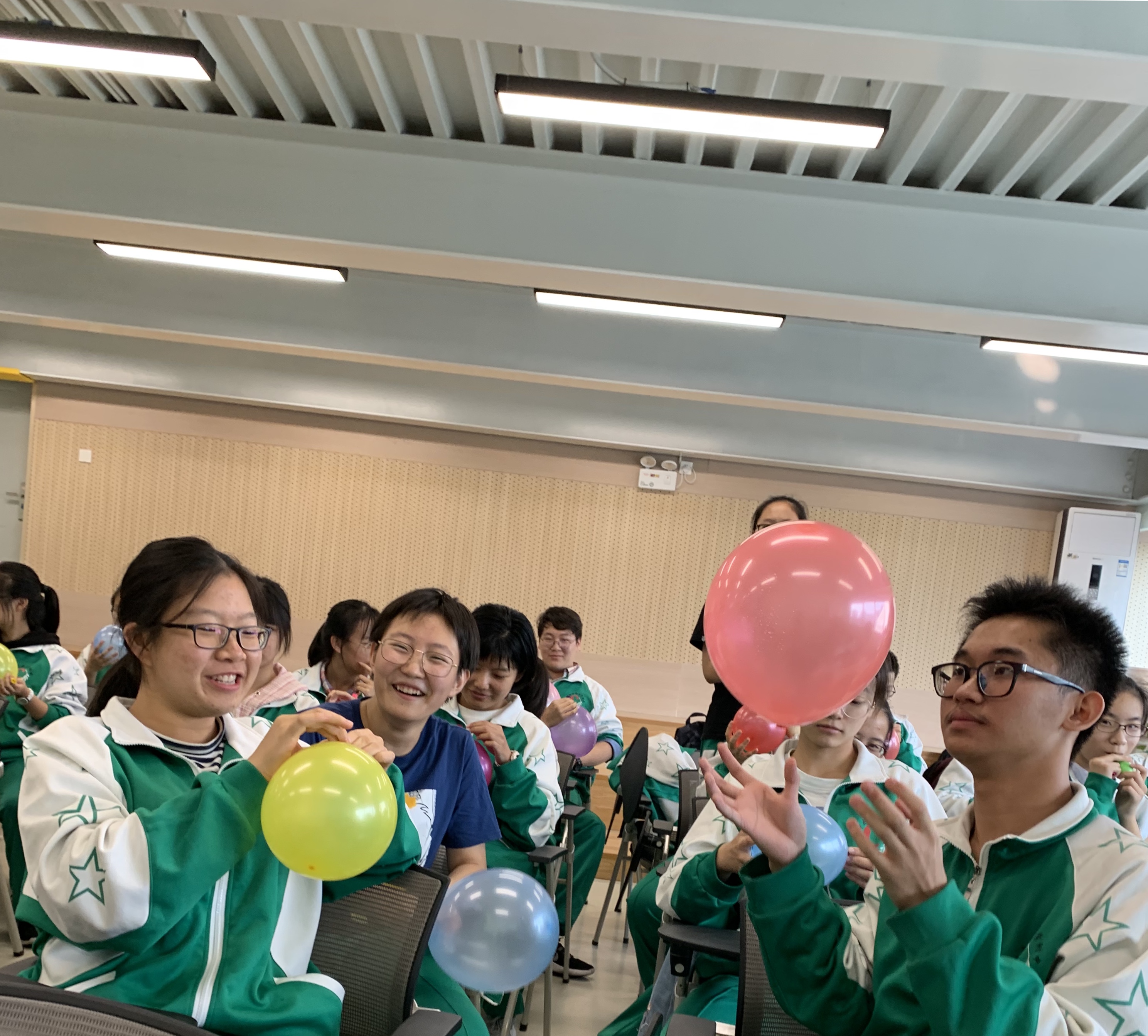 孔老师带领学生们通过穿越A4纸、抱棍跑、极速60秒、吹气球团体雕塑等一系列团体游戏互动,把动态活动和静心体验相结合,身体运动和心理减压相结合,引领同学们在参与、体验、分享中释放压力,放松身心。