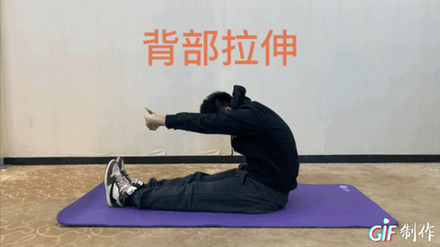 坐姿,双腿伸直,双手十指交叉相扣,掌心对着身体,然后翻掌用手背对着身体向前推出,低头,身体跟着手前推的力量向后弓背到最大幅度。