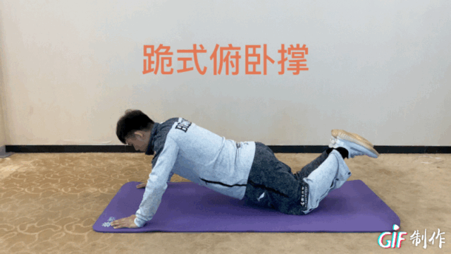 俯卧撑于垫上,腰背挺直,从侧面看身体成一条直线,双手撑于胸部两侧,间距比肩略宽。屈臂俯身至肘关节,然后伸臂起身还原。根据自身情况可选择跪姿俯卧撑。