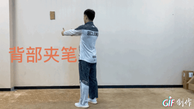 自然站立抬起双臂至于地面平行,双手握拳,拇指朝上用力收缩上背部,保持2-3秒,还原。