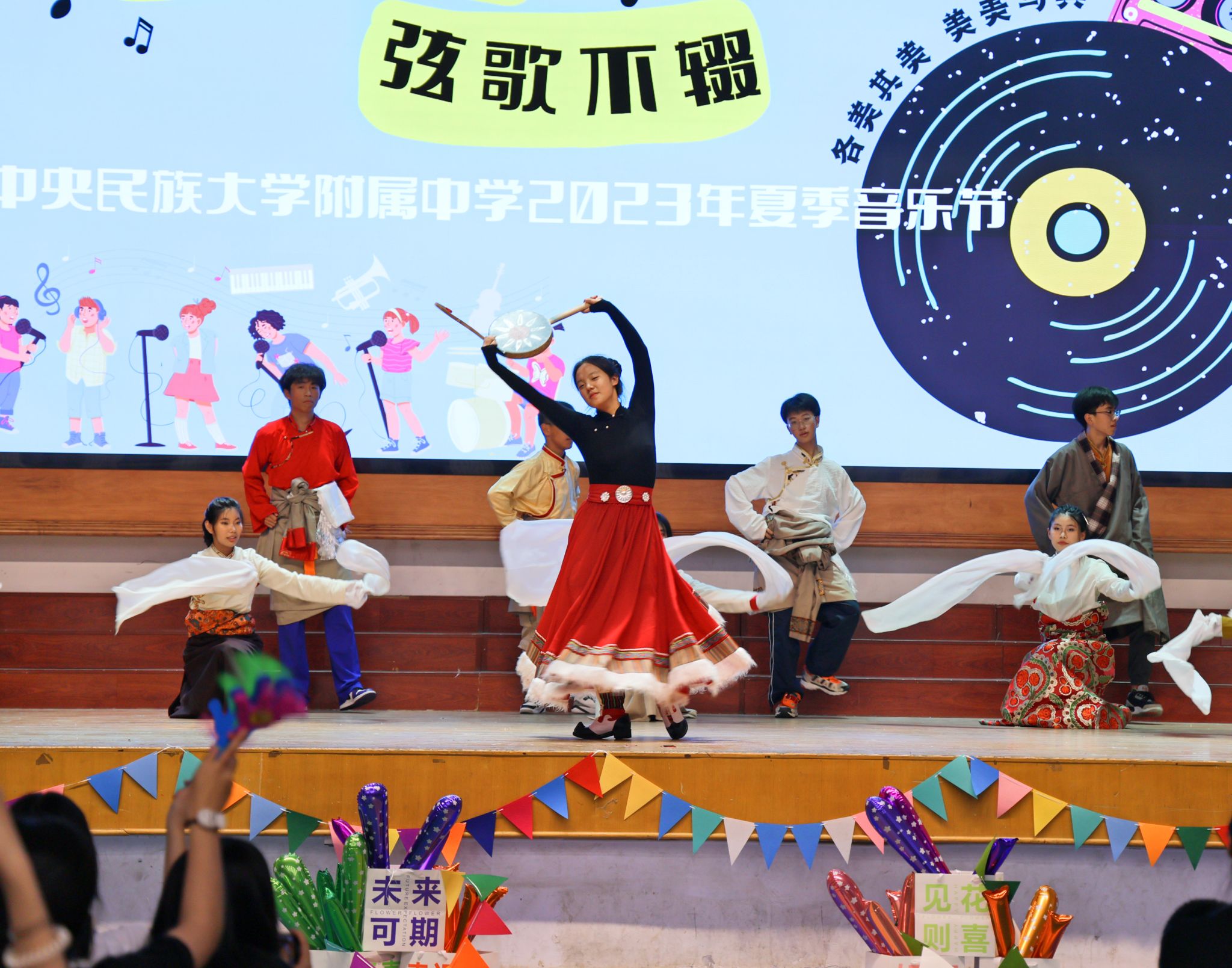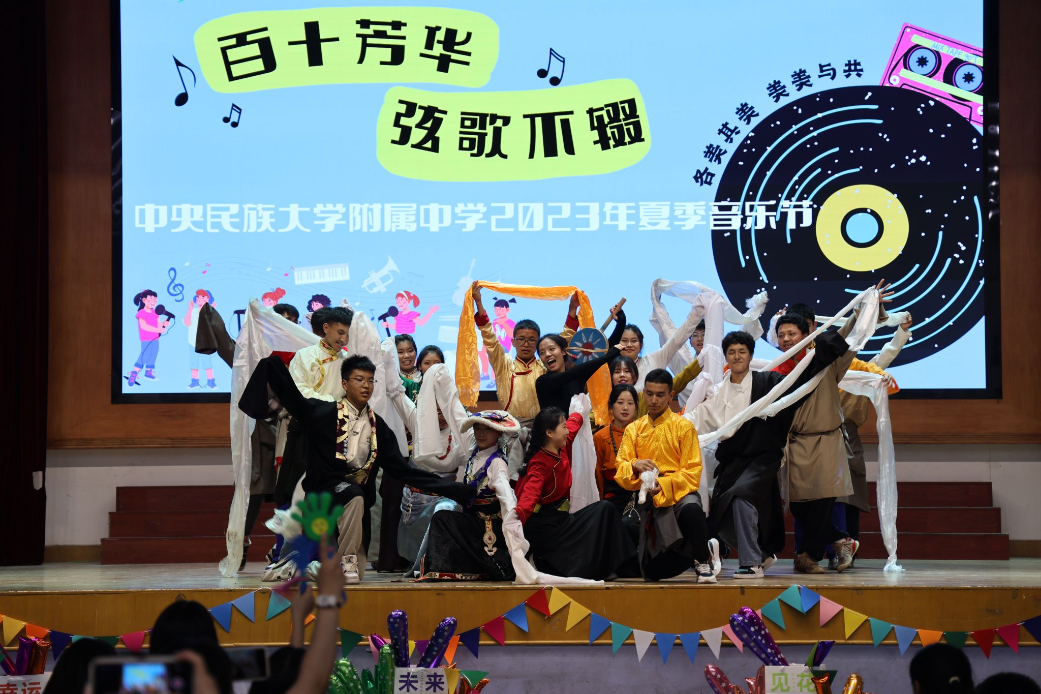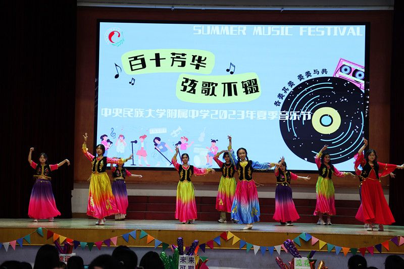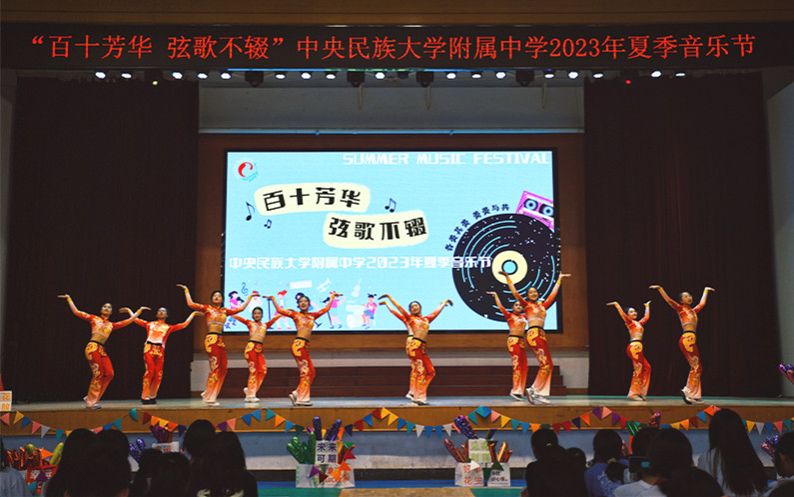 动感十足街舞表演开启青春盛会,乐队表演、民族舞串烧、合唱、街舞表演、说唱、民族健身操……精彩纷呈的表演应接不暇,同学们自信大方地展示着民附学子激情昂扬的青春风貌,更有我校数学组毕海明、张雨石两位教师现场演绎,引燃全场。节目最后,各族学子载歌载舞,绘就同心圆,为民附110岁的生日送去美好祝福。