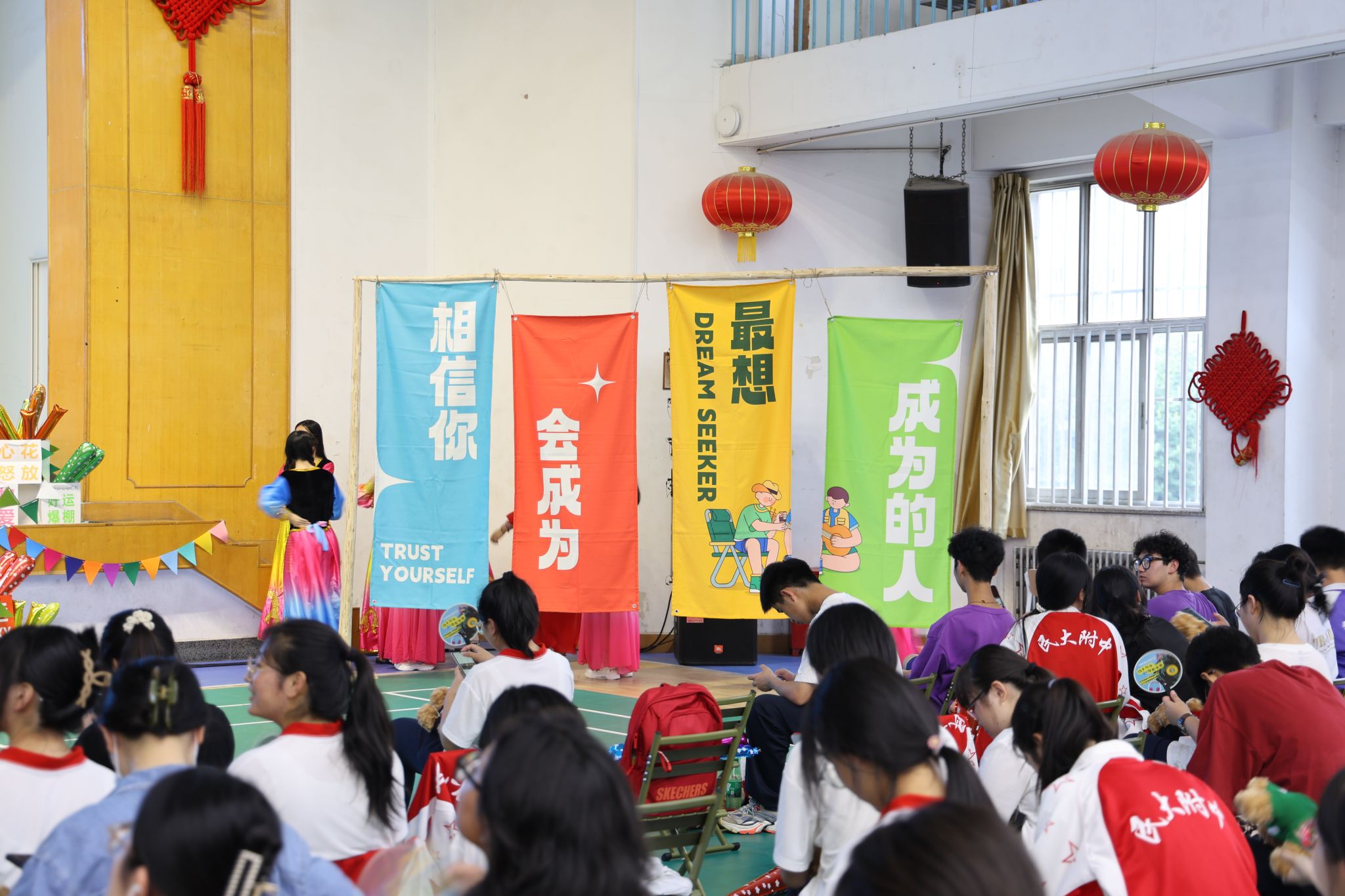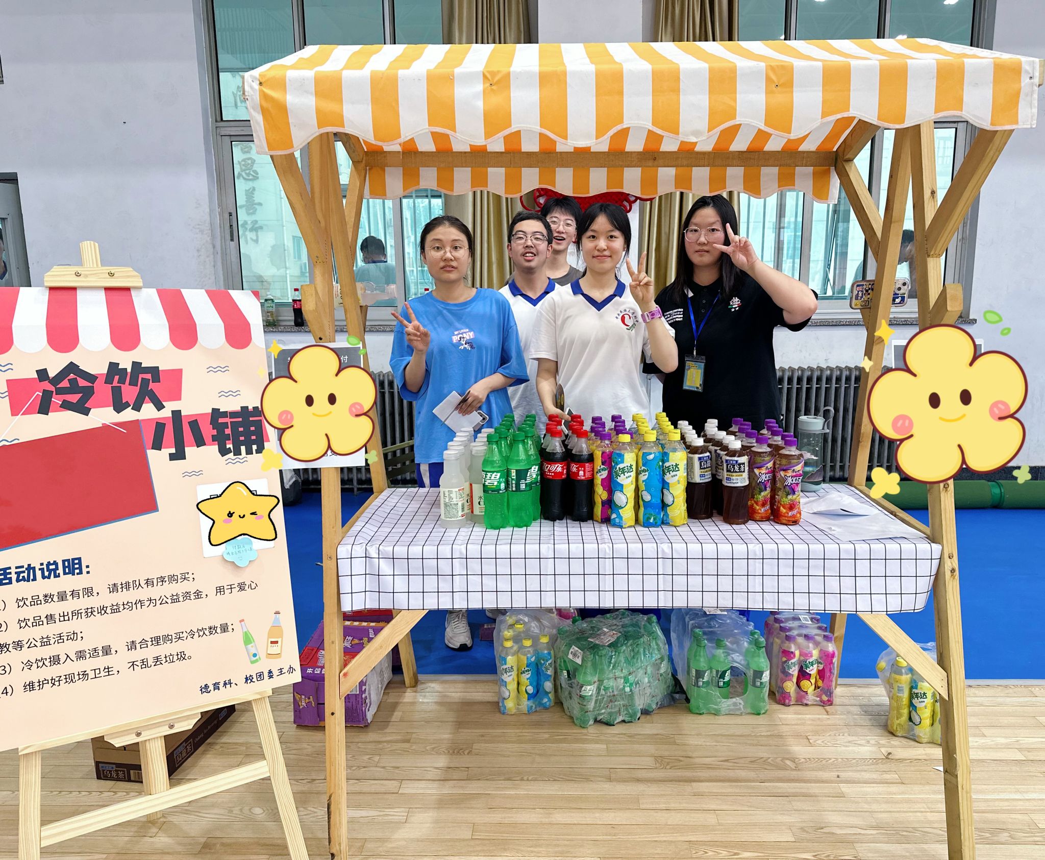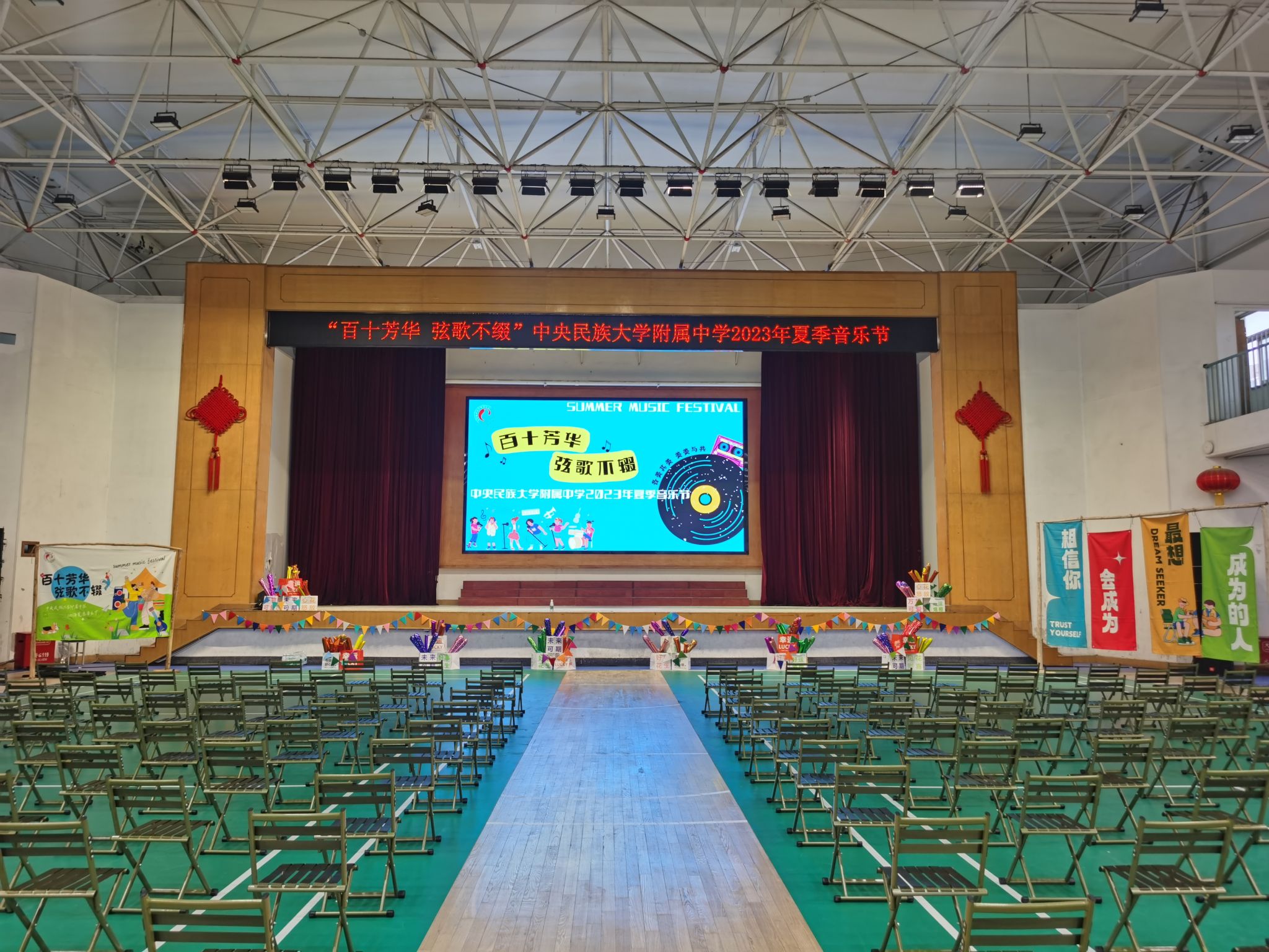 夜幕降临,舞台璀璨。喷绘彩旗青春热烈、冷饮小铺火热开张、校服熊憨态可掬、各类气氛道具整齐摆放,处处用心用情,等待着一场青春盛宴!