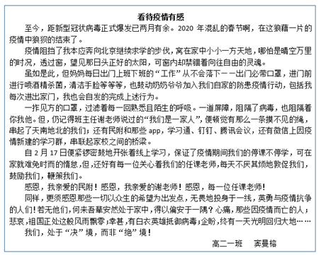 五、高二年级积极开爱国主义教育、民族团结教育。通过组织全国各地学生向在抗疫一线工作的家长、向留在湖北的学生和家长“送关爱”“为他们加油”等线上活动,对学生进行生命教育、身心健康教育、同伴教育。