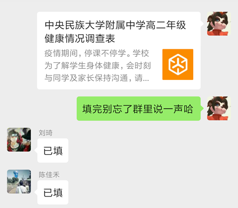 二、疫情当口,学习不能停,健康更重要。按照上级部门和学校关于学生信息统计的要求,准确掌握全体京内外学生情况,班主任对学生人人心中有数,坚持健康打卡,有异常及时反馈。