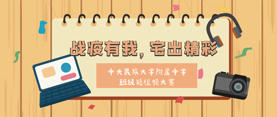 为进一步加强班级建设,丰富居家生活,鼓励各民族同学结合本民族文化或特色积极展现在延期开学期间自主学习、体育锻炼、才艺创作、劳动实践活动的精彩瞬间,在全校开展以“战疫有我,宅出精彩”为主题的短视频展示活动。