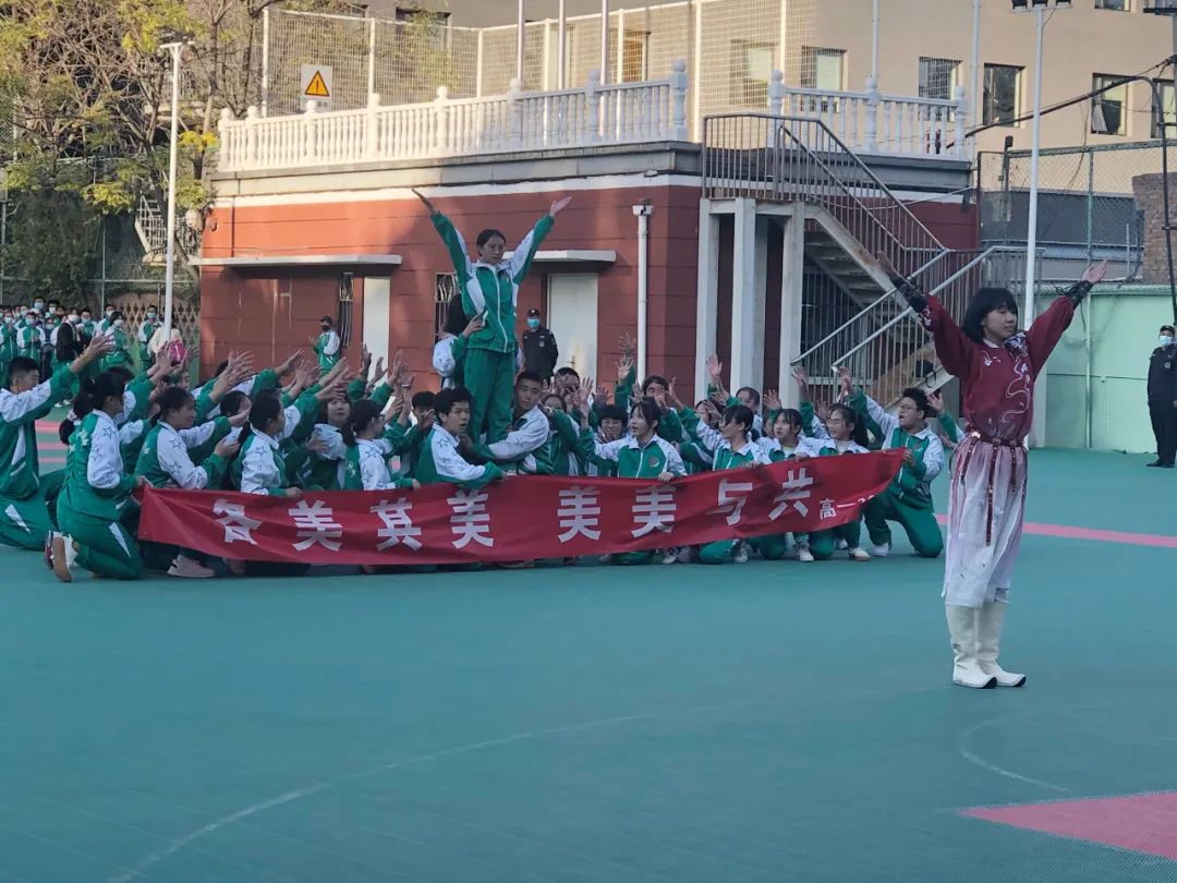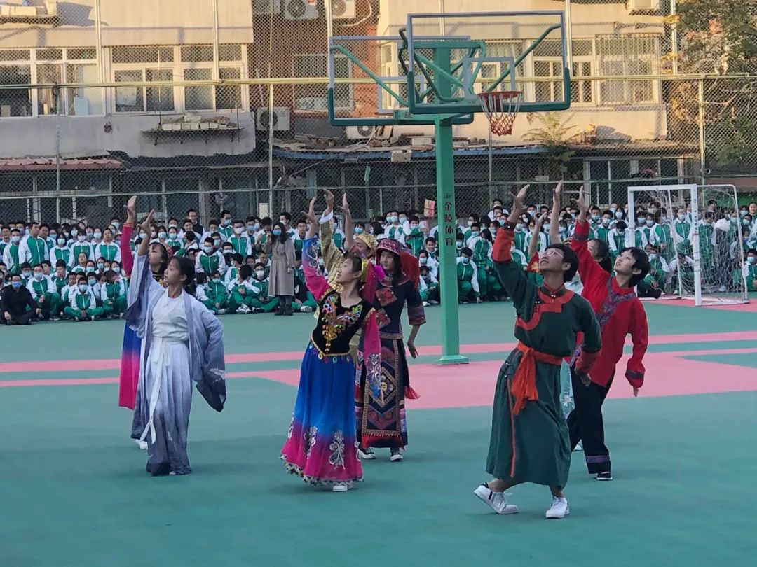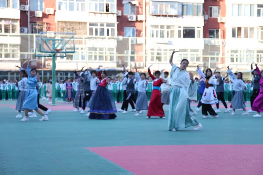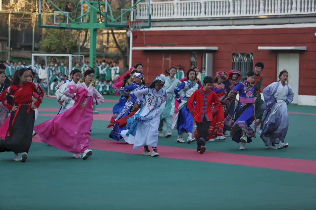 各班展示后,由各班代表们组成了民族展示方阵,伴着《爱我中华》的旋律,以舒展娴熟的优美动作,充分展现了“各美其美、美美与共”!
