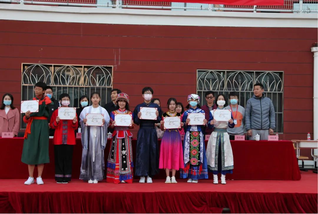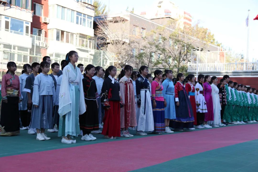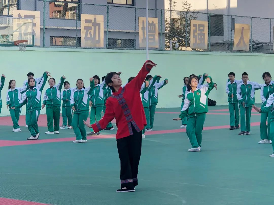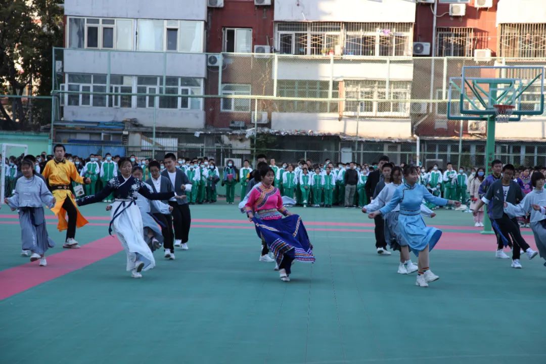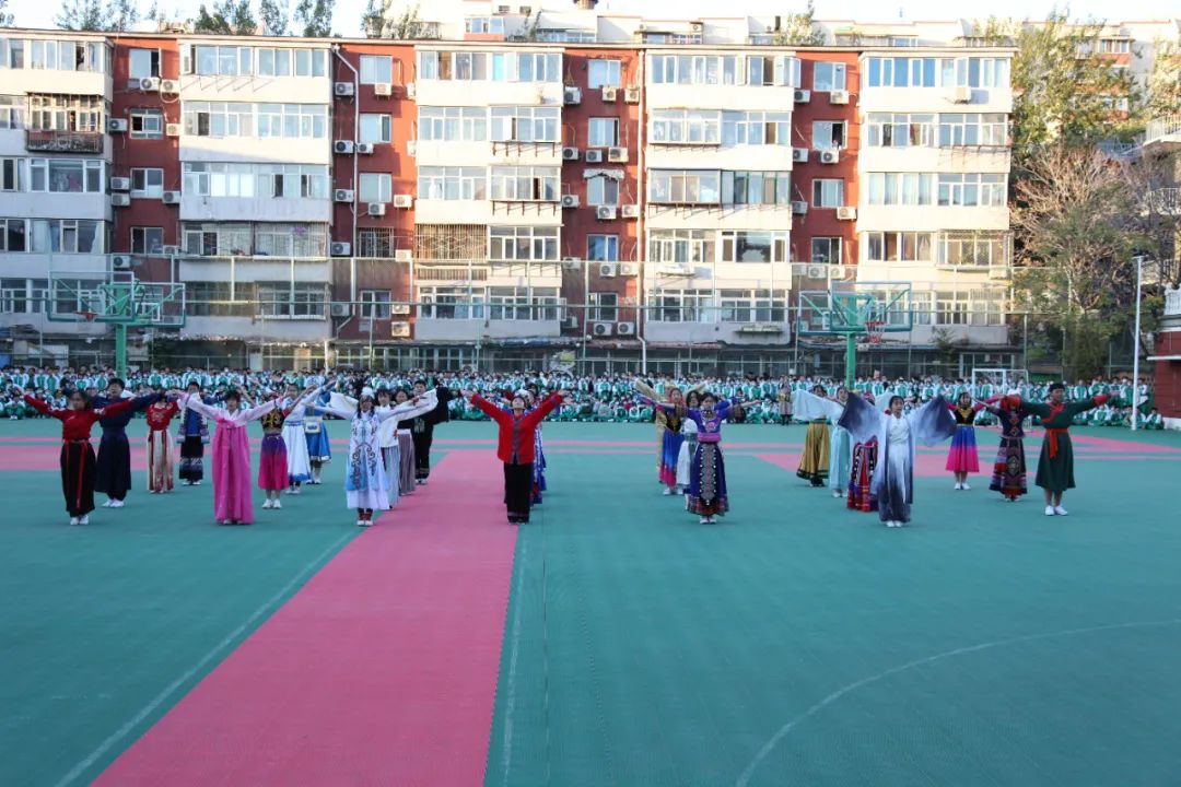 各班展示后,由各班代表们组成了民族展示方阵,伴着《爱我中华》的旋律,以舒展娴熟的优美动作,充分展现了“各美其美、美美与共”!