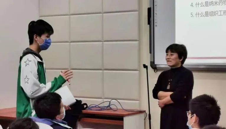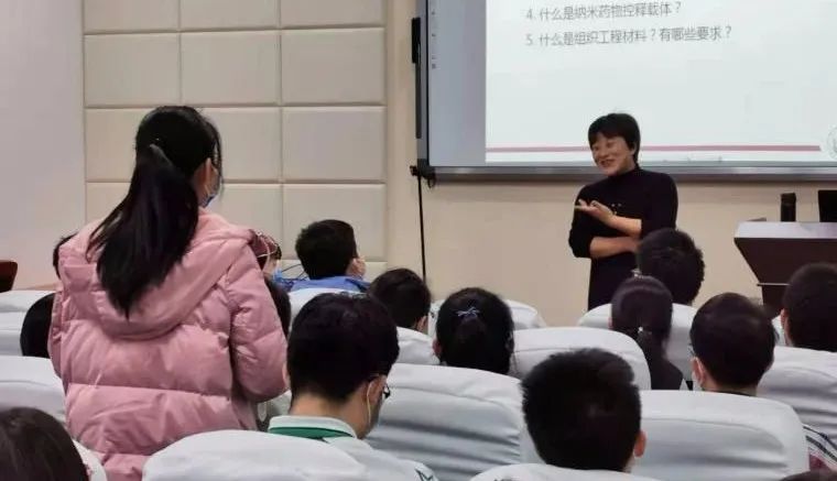 袁教授主要向同学们介绍了人类健康面临的挑战、延长寿命解除病痛提高生活质量可能的解决方案和材料在生物医疗中的应用。胶束、囊泡、靶向,一个个全新的词汇为同学们打开新世界的大门,看起来高深的课题,通过袁教授深入浅出的讲解变得通俗易懂。