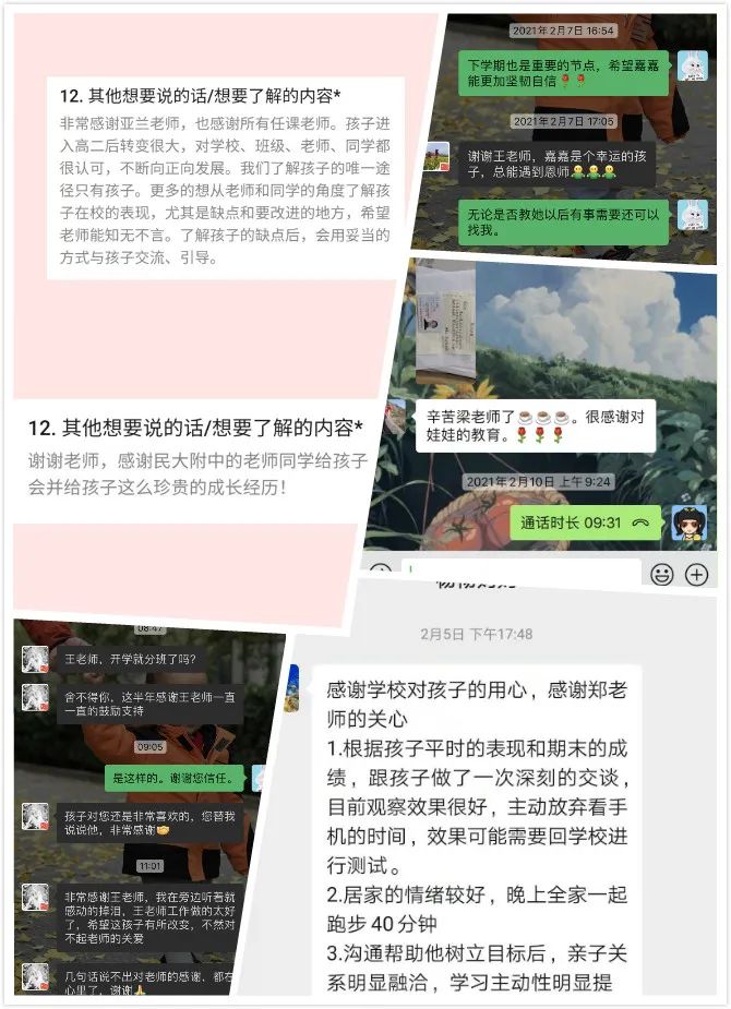 家访过程中,老师们克服了偏远地区手机网络信号不稳定、部分少数民族学生家长语言沟通不顺畅等困难,不仅细致了解学生在家的学习、身体、情绪状况,而且就如何在居家期间合理有效地进行疫情防护,如何科学安排学习锻炼计划、调整学习状态、保持乐观向上情绪状态等问题给出了有效的建议。恰逢春节,老师们还在交流中把来自首都北京、来自学校的问候和祝福送到各族学生和家长身边,得到了家长朋友们的一致好评和称赞!