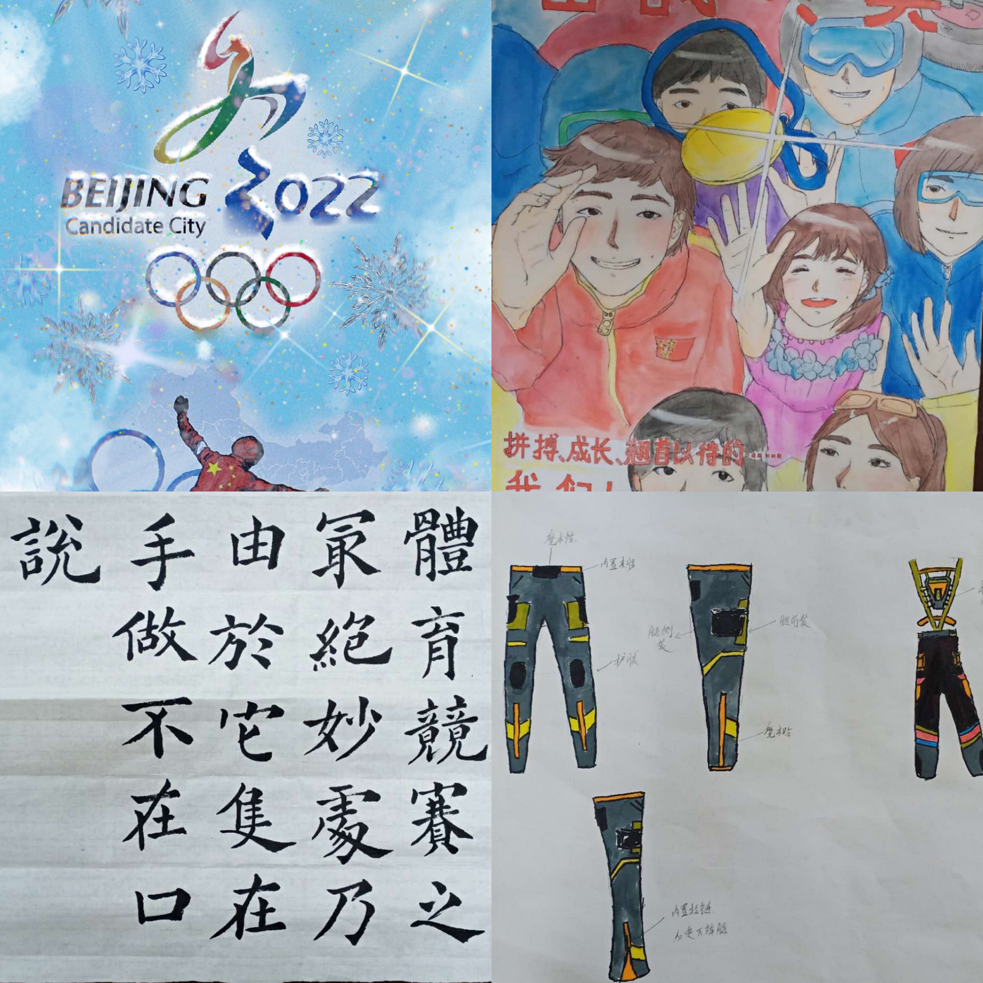 疫情期间,为丰富课余生活,促进学生身心健康全面发展,学校还组织学生开展了冬奥题材文艺作品征集活动,鼓励学生通过书法、绘画、服装设计等艺术手法宣传奥运文化。各族学子通过思考,用手中的笔墨表达出自己对北京冬奥和冰雪运动的理解与热爱。
