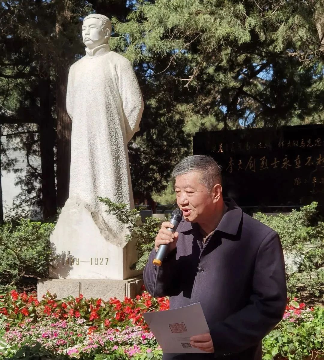李建生先生讲话并带领师生及校友代表瞻仰碑文。他讲到,正值党史学习教育全面铺开之际,民大附中党委举办这样的主题教育非常有意义。他首先回顾了大钊先生青年时代立志为苦难的中国寻求出路,积极参与新文化运动并发表了《青春》宣言,号召青年“冲决历史之桎梏,涤荡历史之积秽,新造民族之生命,挽回民族之青春……”