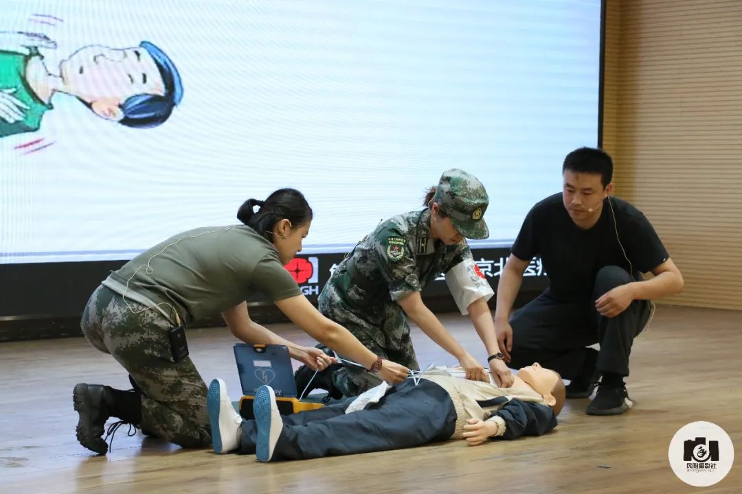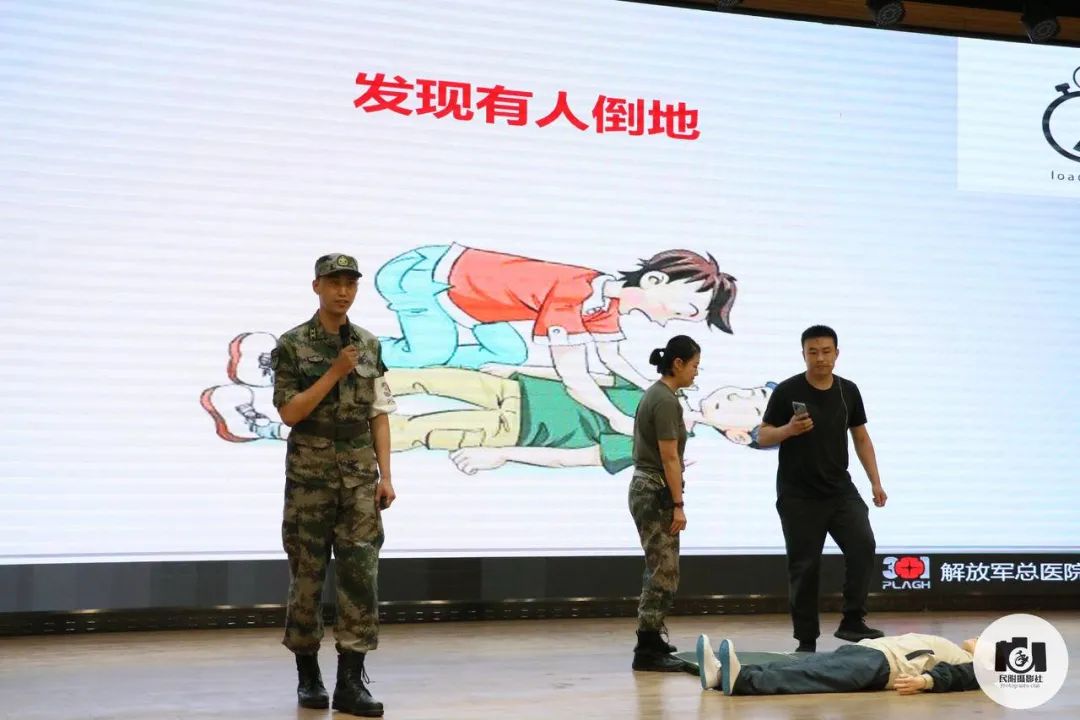 专家团队的医护人员亲身示范正确的心肺复苏操作并且向同学们细致形象地讲解心肺复苏的步骤。