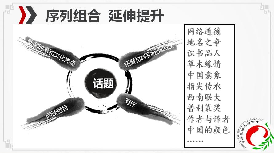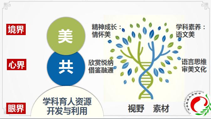 培育具有民族情怀、人文见长、才能卓越 、社会担当的民族精英、国家栋梁,是民大附中坚守的育人目标。民附语文人也据此一直尝试构建一种语文素养与精神成长的双螺旋上升模式。通过语言、思维、审美、文化的输入,让学生在面对广阔世界时学会欣赏他人、悦纳自己,善于借鉴、实现融通,输出为语文美与情怀美。老师们着眼于学科育人资源的开发与利用,力求打造“共·美”特色课堂。