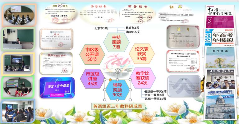 英语组全员积极参加海淀研修活动,借力北外和教科研院校专家的指导,学科组和备课组定期有计划地开展集体教研,组织教学观摩、磨课评课、课题开题论证会等活动,老教师传经送宝,骨干教师发挥示范引领作用,许多青年教师积极、主动地加强教育理论的学习和研究,借助海淀和学校教研平台正在科研与教学实践中茁壮成长。