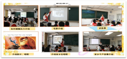 在扎实推进国家课程的同时,教师通过整合教材,联系生活实际,为学生创设情境,搭建支架,探索多样化,符合学生特点和语言水平,提升品位的生动、趣味、启思的英语课堂。同学们利用课前五分钟展示环节,介绍自己家乡的美食文化、风景名胜,配音、唱歌;课上结合教学内容剪纸、表演短剧、辩论、演讲,课后设计海报、宣传册、写英文诗歌、影评等夯实语言知识,将听说、绘画、唱歌等多项技能融合在一起。