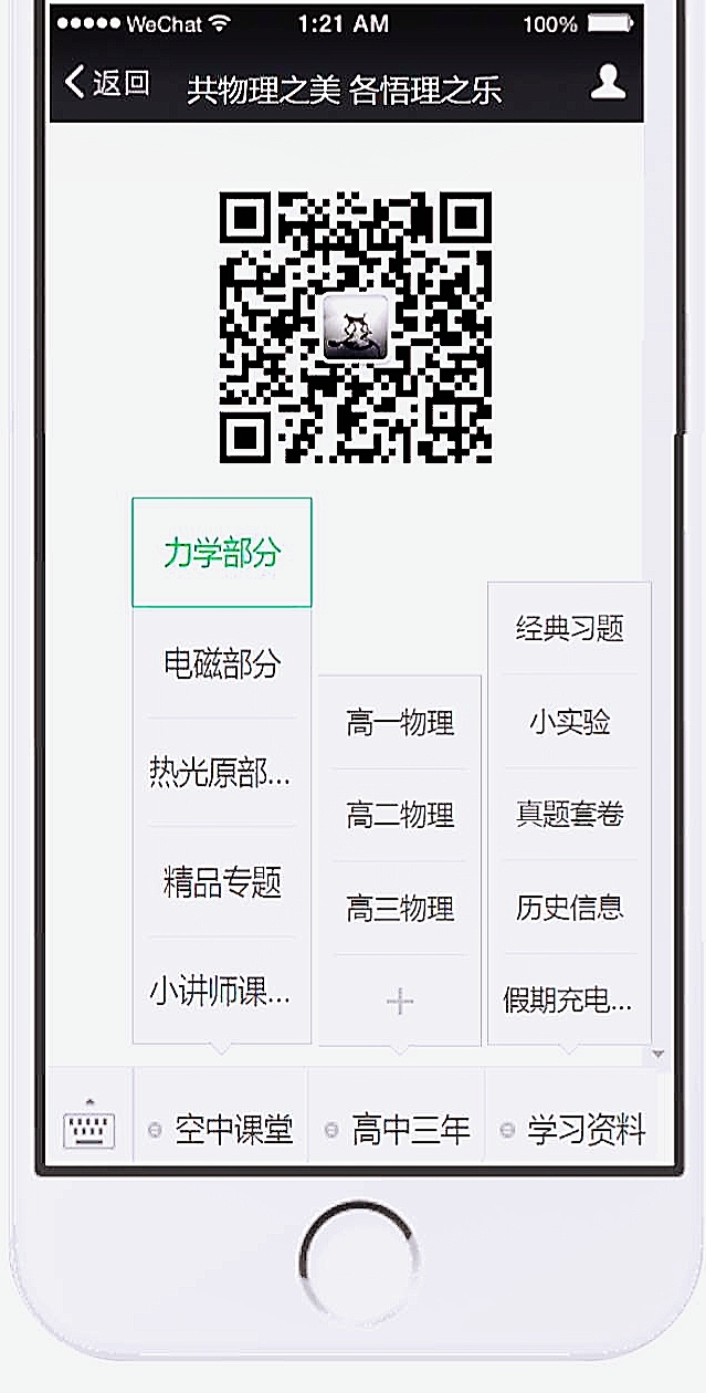 不仅如此,为了让学生打破时间和空间的限制,无时无刻地遨游在物理的海洋里,物理组建立了自己的微信公共号——“共物理之美,各悟理之乐”。公共号中,不仅包含了高中三年经典知识微课讲解,更是有各种趣味物理小实验的操作与原理讲解,和学生自主参与的“小讲师课堂”,真正让学生成走上讲台,展现自我。在此平台,学生可以真正成为知识学习的主人,不仅是学习者,更是研究者,传授者。