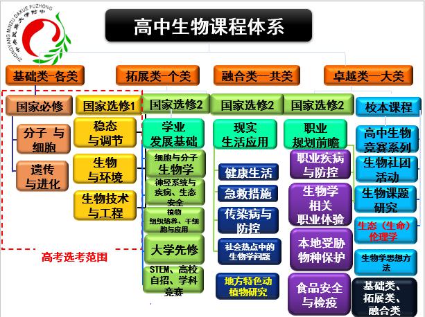 为实现学生全面发展,学科组以“让来自不同地域、不同民族、不同文化背景的学生实现共同发展”为课程目标,精心构建了民族特色鲜明、课程资源丰富、课程设置合理的民大附中生物学科特色课程体系。