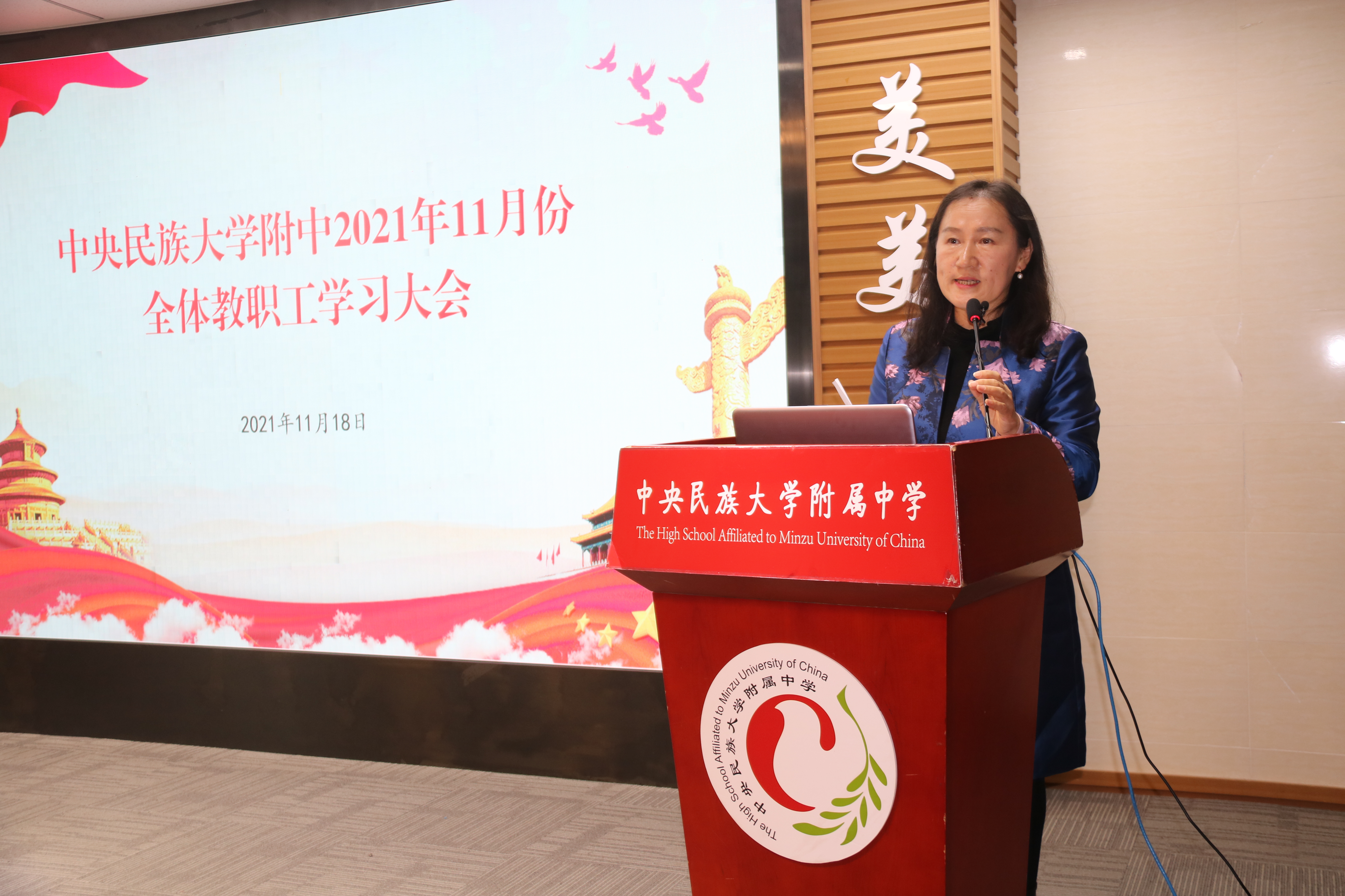 佟丽娟书记在报告会结束后总结指出,感谢张教授为民大附中广大教师深入学习习近平总书记关于坚持“一国两制”和推进祖国统一的重要论述提供了系统的辅导,对我校今后开展涉台青少年教育工作、党委统战工作提供了思想方法指导。佟书记号召广大党员教师要以正确的历史观、民族观、国家观化育学生,共同克服困难,想方设法开展好两岸师生交流活动,为促进两岸同胞心灵契合,早日实现祖国统一做出中央民大附中自己的贡献。