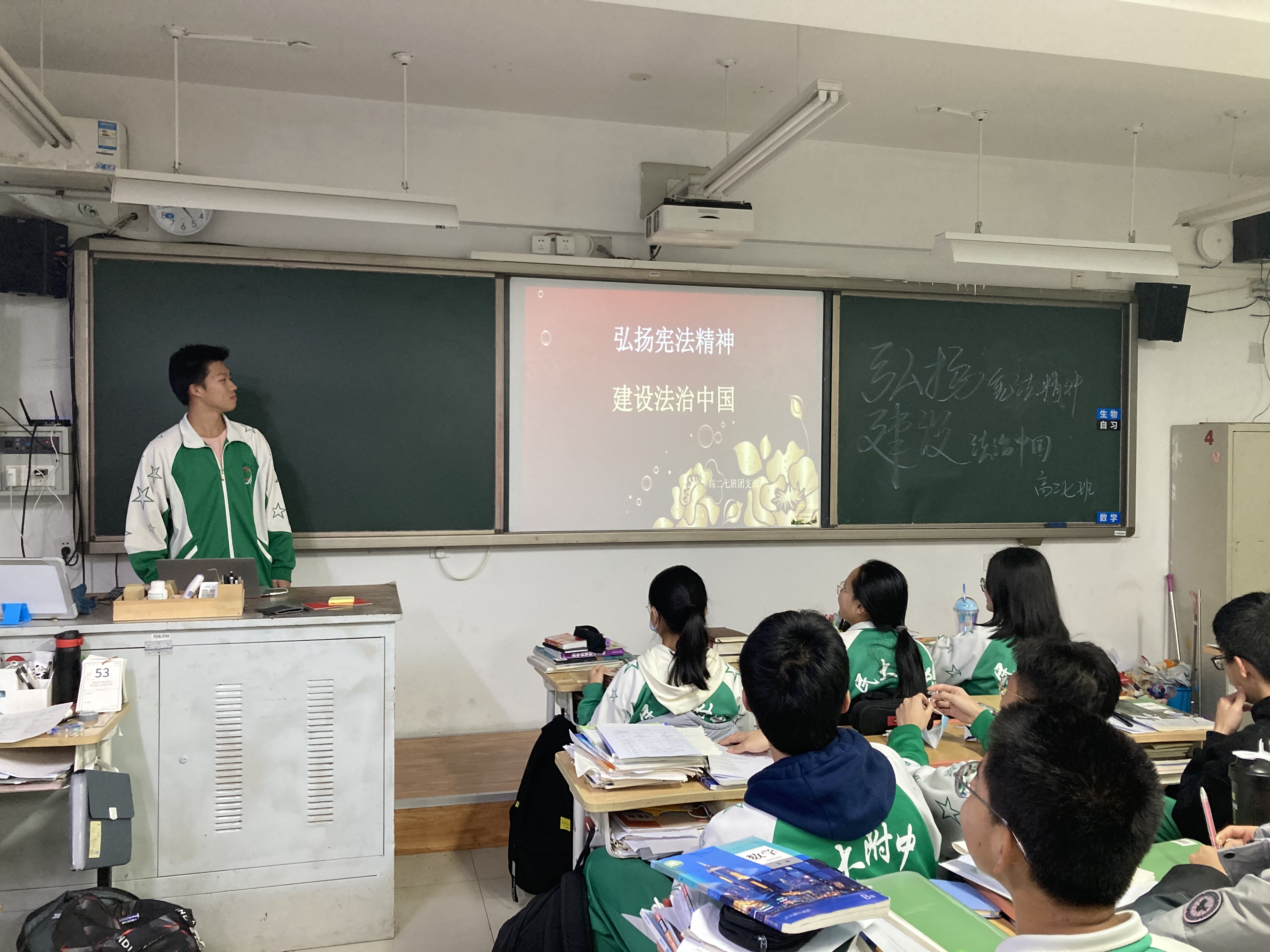 当天下午,各班分别开展了“弘扬宪法精神 建设法治中国”主题班会。学校为各班配发了《中华人民共和国宪法》读本,并鼓励同学们以党的十九届六中全会精神为引领,学习宪法内容,增强法治观念,尊重宪法和法律权威,遵守校规校纪,为建设法治中国贡献力量。
