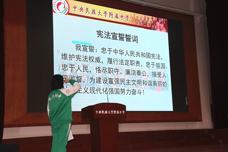 为深入学习贯彻习近平法治思想,扎实推进民大附中法治宣传教育工作,进一步引导广大师生增强社会主义法治观念和法治素养,学校党委于11月29日上午,在海淀校区举行“弘扬宪法精神 建设法治中国”主题教育暨“第8个国家宪法日”宣誓活动。校党委书记佟丽娟,党委副书记、常务副校长唐洪波等全体校领导,万寿寺派出所庞博警官及全体教职工、各班学生代表参加活动。