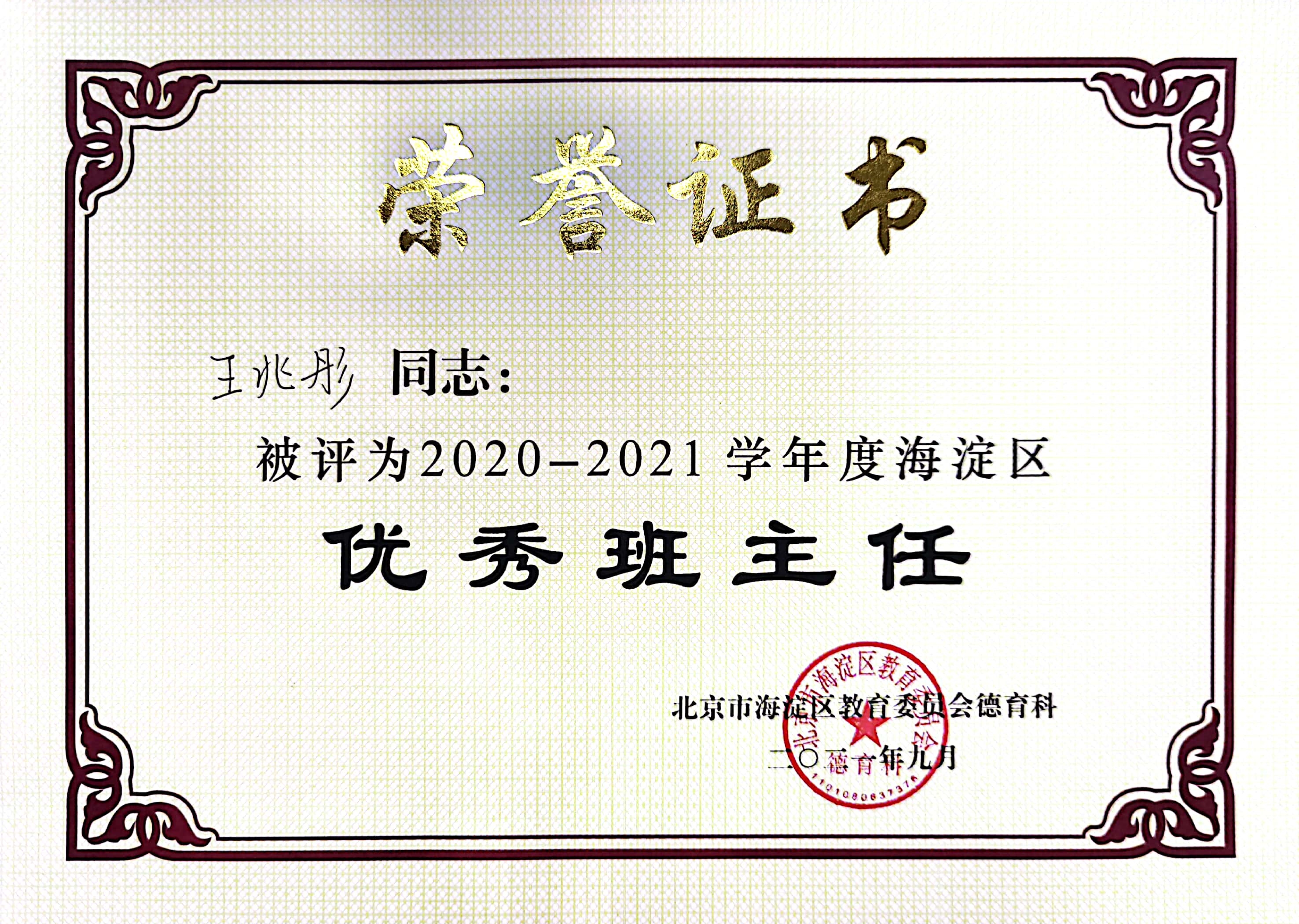 王兆彤,英语教师,被评为海淀区“优秀班主任”,william威廉中文官网附属中学“优秀教师”和“优秀班主任”。