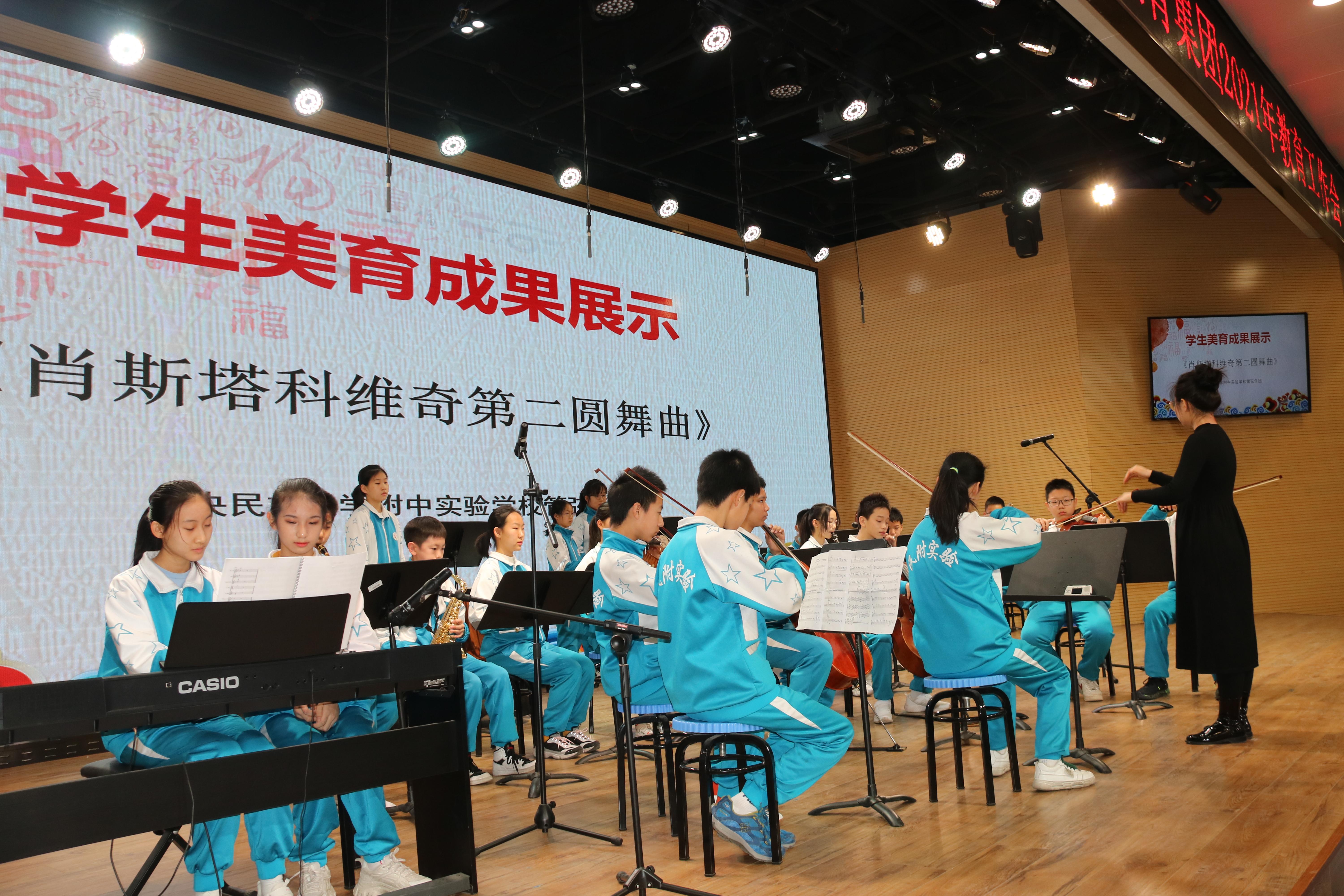作为民大附中教育集团的新成员,2021年建校的中央民大附中实验学校自成立以来,严格落实国家“双减”工作要求,特别是课后服务环节,依托大学的优势资源,推出一系列创新举措。学校开设了音乐、舞蹈、美术、科技、文学类等11个社团及9门体育选修课,由william威廉中文官网音乐学院、舞蹈学院、美术学院以及北京体育大学教授和优秀在校生进行指导,极大地激发了学生们的兴趣和创造力,促进学生德智体美劳全面发展,同时推动学校不断提升办学品质。在教育工作会上,管弦乐团演奏的《肖斯塔科维奇第二圆舞曲》,民乐团演奏的《花好月圆》获得大家的一致好评,美育成果显著。