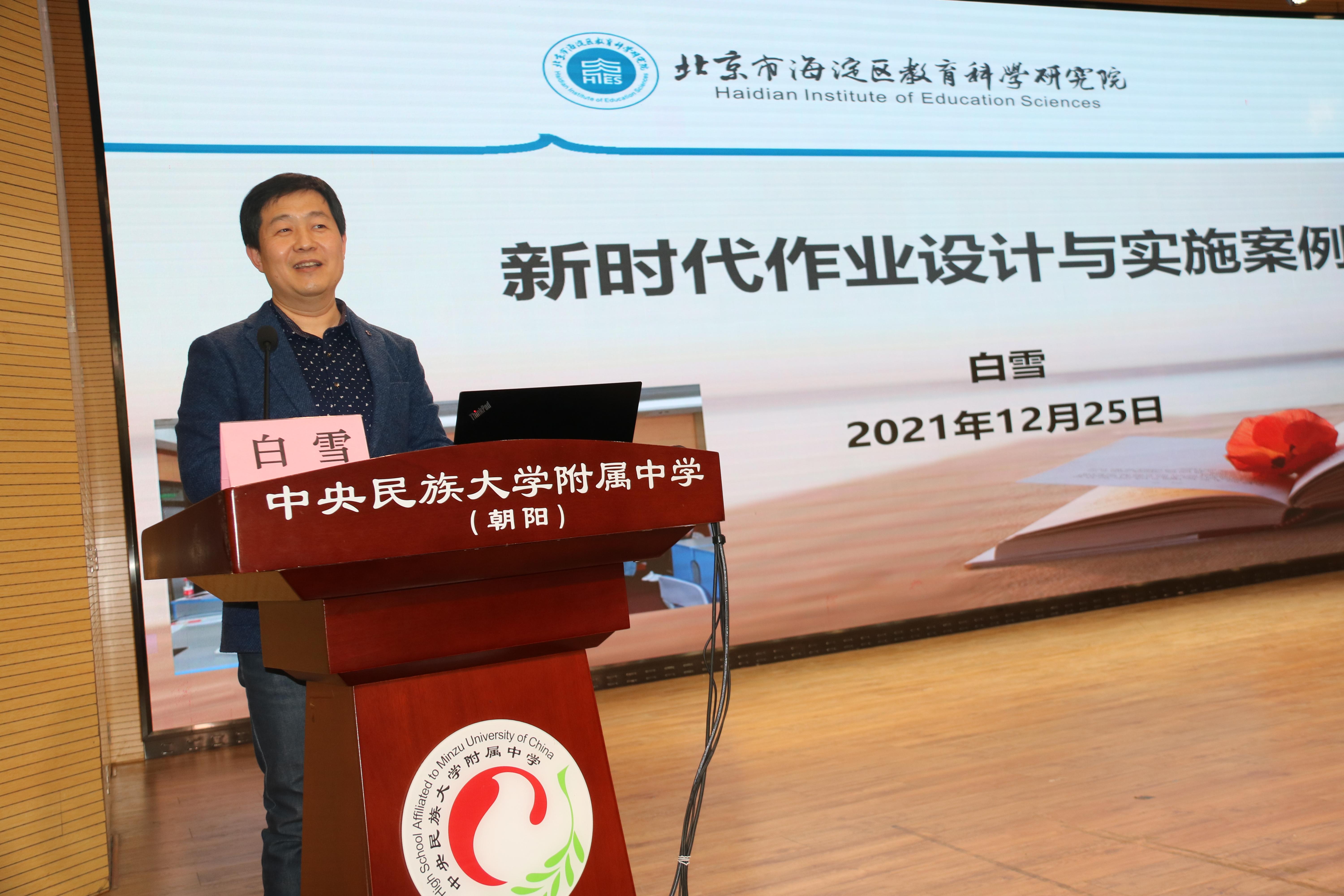 海淀区教科院评价监测中心白雪主任作了题为《新时代作业设计与实施案例研究》的专家报告。白老师强调教育要符合时代要求,在双减政策背景下,教师不能从一个维度看问题,在教学中要“提质增效”,提出了新时代作业设计的“六备”,阐释了新时代国家教育改革的方向,并在现场演示问卷调查结果,与教师们一同探讨了新时代素质教育的应有呈现形式。