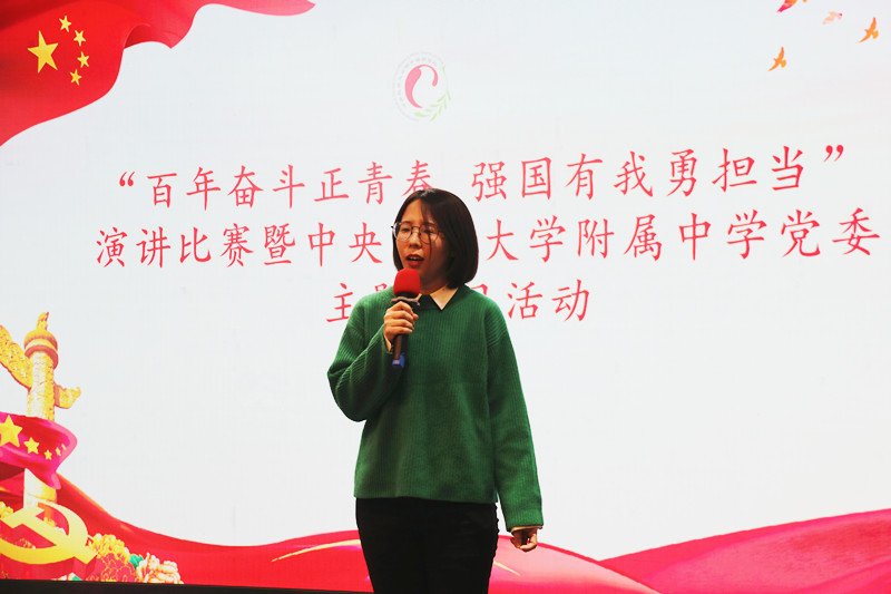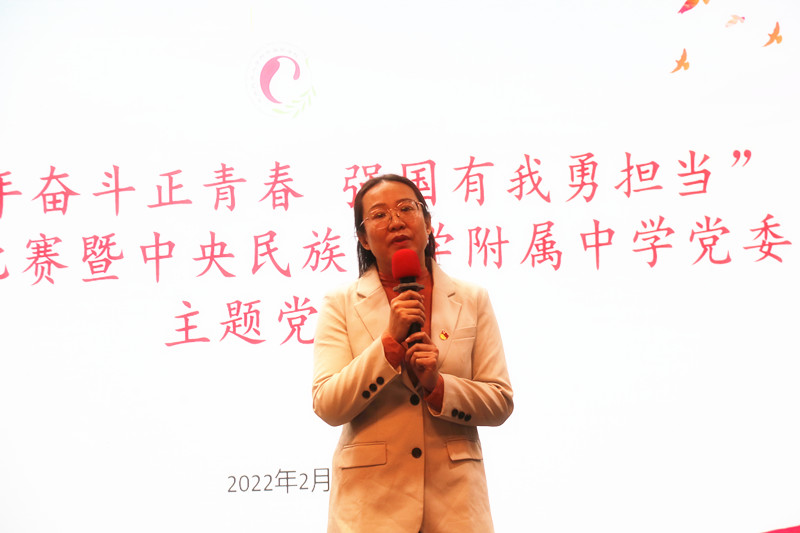 行政、校友会基金会幼儿园联合党支部杨娜老师以《自强不息,团结奋斗——以愚公移山精神做新时代奋斗者,助力民附教育事业高质量发展》为题,分享了民大附中在经过了岁月洗礼后的新百年的道路上,身边的领导们高瞻远瞩、引领传承、指点迷津,同事们默默无闻、勇于担当、积极奉献,努力践行着愚公精神。未来也必将逢山开路、遇水架桥,攻坚克难,以更昂扬的姿态、更饱满的热情、更努力的奋斗保障民附事业高质量发展,续写少数民族基础教育新的辉煌!