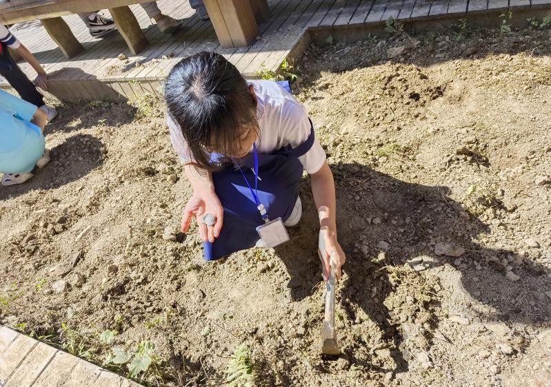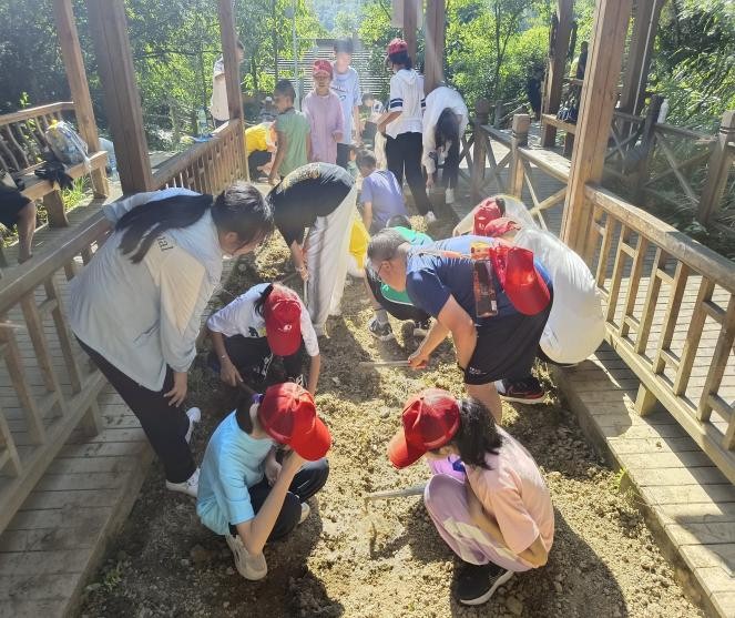 挖掘化石,探中国帽筒演变。沿着天坑栈道返程途中,到达一山泉冲击处,在导游的指导下,营员们在泥土中挖掘,收获了不少“战利品”。
