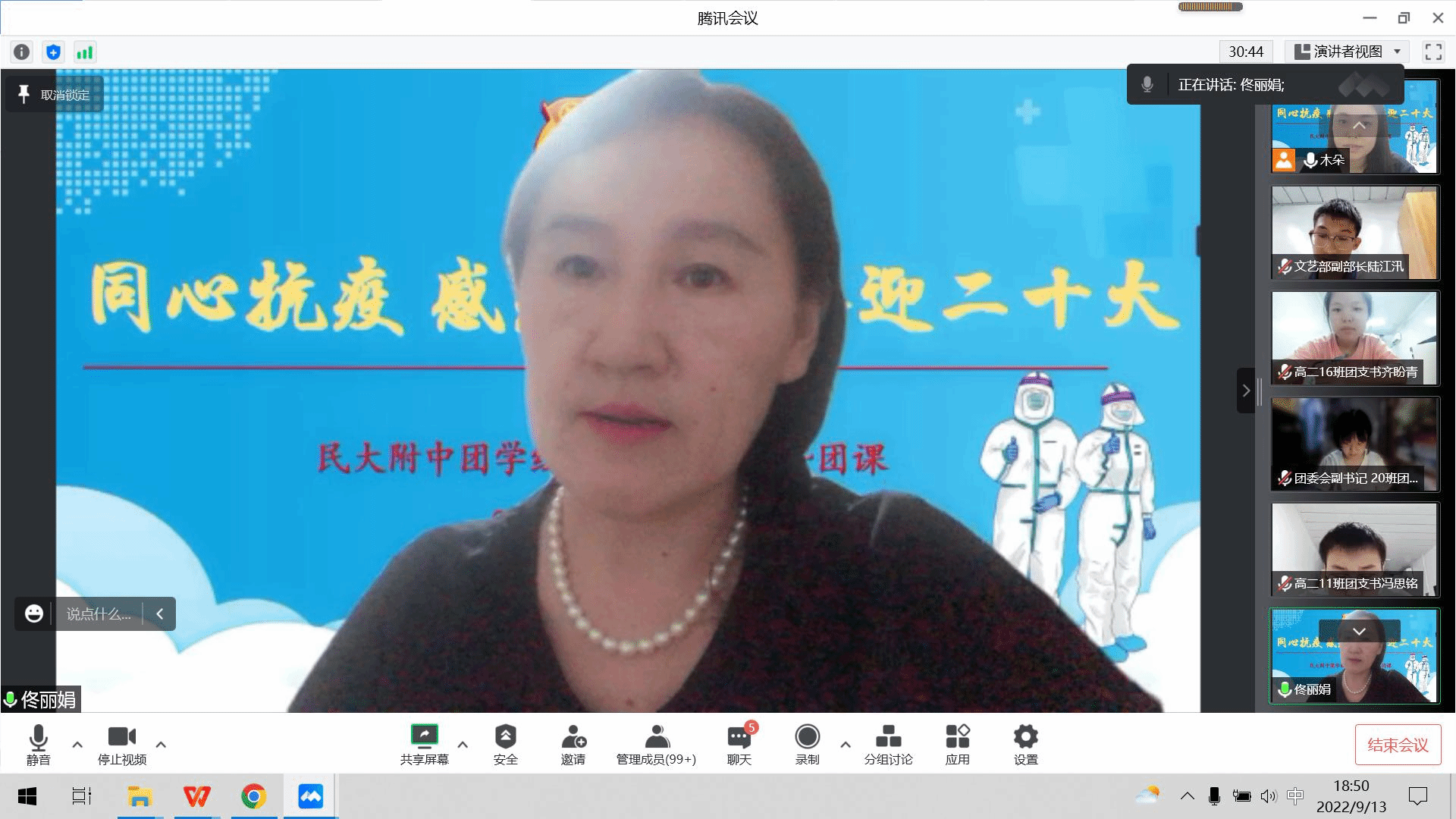 为进一步落实学校疫情防控政策,激发民附学子昂扬斗志,在青年中厚植家国情怀,引导广大青年学生统一思想、凝聚共识,勇于担当,以实际行动践行伟大抗疫精神,9月13日晚,我校团委通过线上形式召开团学干部会暨“疫情防控”思政课,校党委常务副书记佟丽娟为团学干部作了题为《同心抗疫 感恩担当 喜迎二十大》的团课讲座(大思政课)。团委副书记车畅、各年级团干部代表、青年代表、校级学生骨干近150人线上参会。本次活动由团委书记杨夺主持。