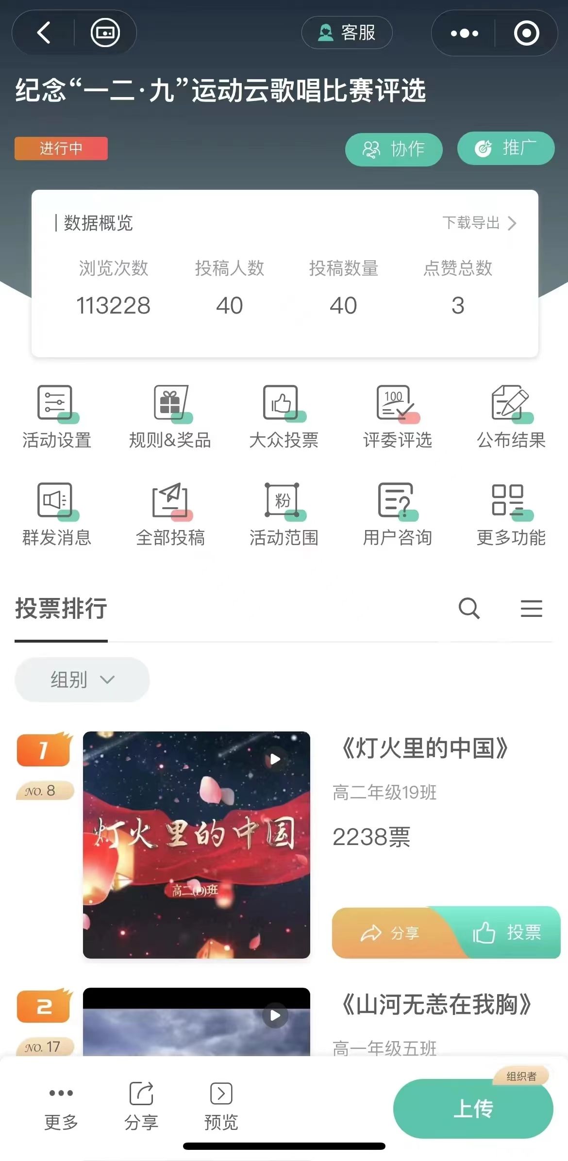 此次比赛采用网络大众投票与评委评选相结合的方式进行评选。第一阶段由网络大众投票选出年级前三名的班级,并颁发最佳人气奖;第二阶段由校领导、干部以及专业教师组成的评委小组根据参赛作品的主题、艺术表现以及学生精神面貌等方面进行了严谨的评分,最终选出本次比赛的优胜队伍。
