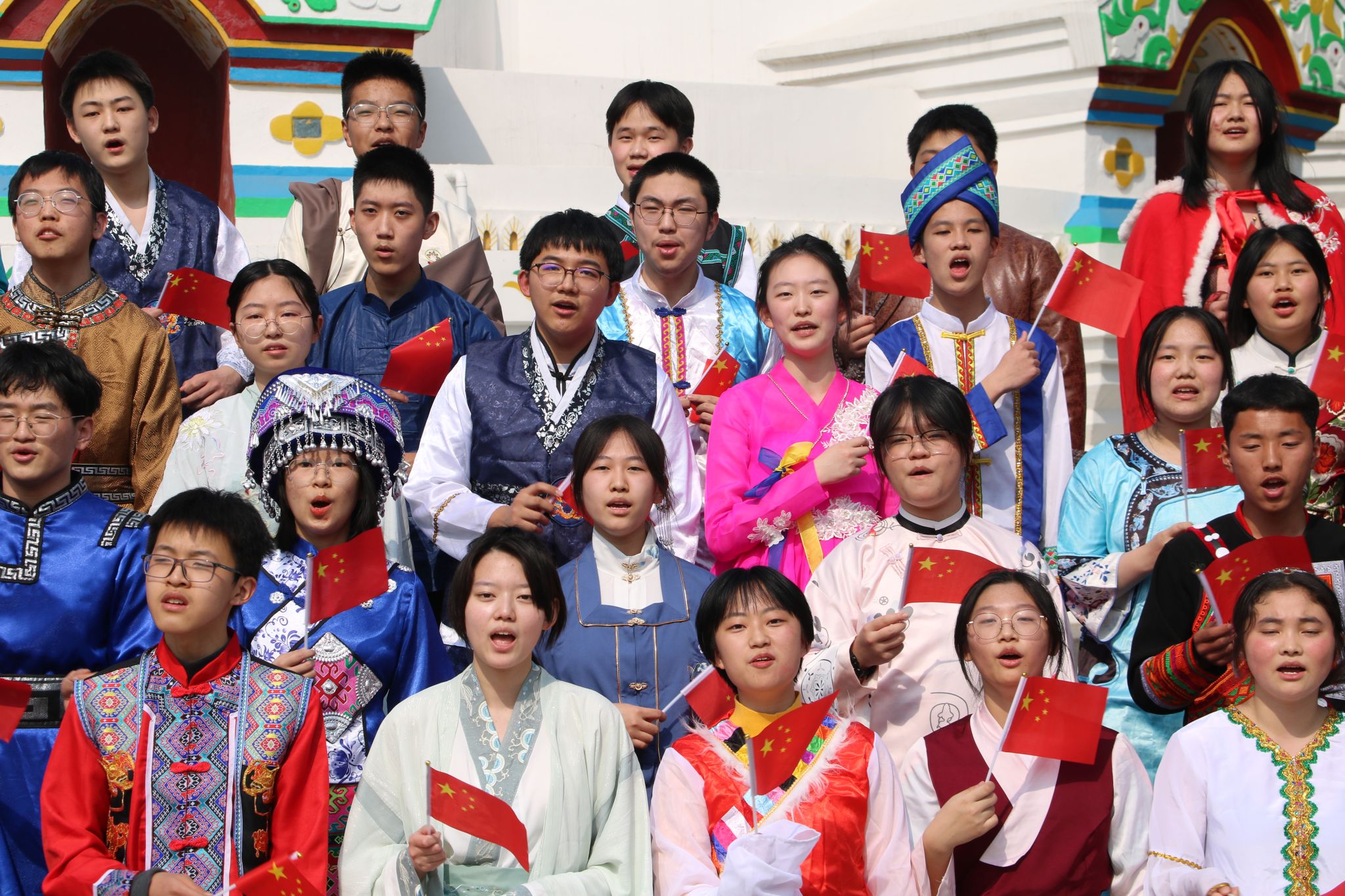 民大附中合唱团精彩献唱《同心共筑中国梦》和《春日》两首歌曲,表达了各民族学子感恩党和国家,坚定对伟大祖国、中华民族、中华文化、中国共产党、中国特色社会主义的高度认同,像石榴籽一样紧紧拥抱在一起,在首都北京、在民大附中这个和谐、温暖、幸福的大家庭里团结奋进、快乐成长的心声。