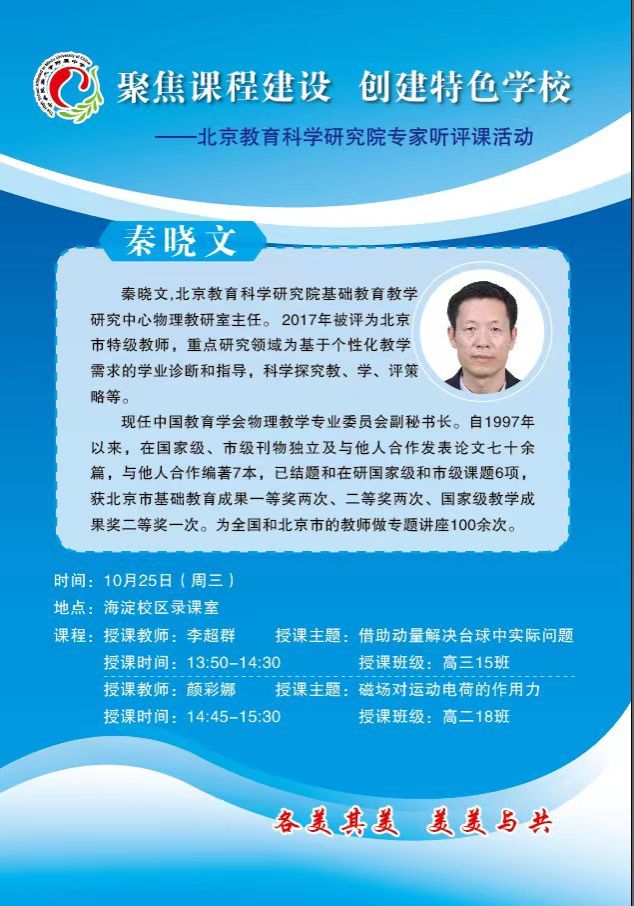 10月26日,北京教育科学研究院基础教育教学研究中心物理教研室主任秦晓文莅临我校进行听评课指导。在听取我校高三教师李超群的《用动量解决台球中的实际问题》、高二颜彩娜老师的《磁场对运动电荷的作用力》两节课后,秦主任对两位老师的授课内容进行了悉心的评价,针对课堂教学的细节和教学方法提出了独到的见解和建议,是教师们一次宝贵的学习机会。